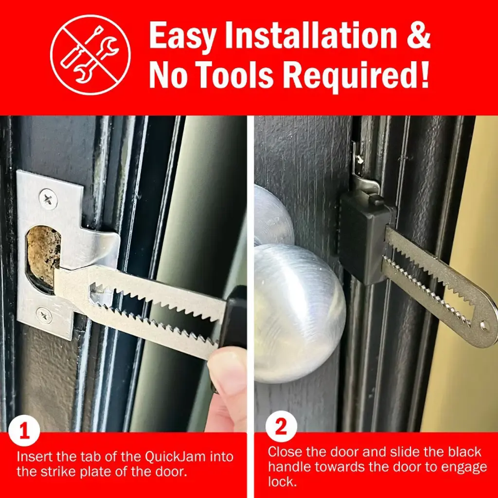 Add an extra layer of security with the The QuickJam Universal Door Blocker. This portable security device installs in seconds and works on most standard residential and commercial doors with a knob or lever. Its discreet size makes it the perfect travel companion for use in hotels, apartments, college dorms, vacation accommodations and more. It’s like having a secondary deadbolt.