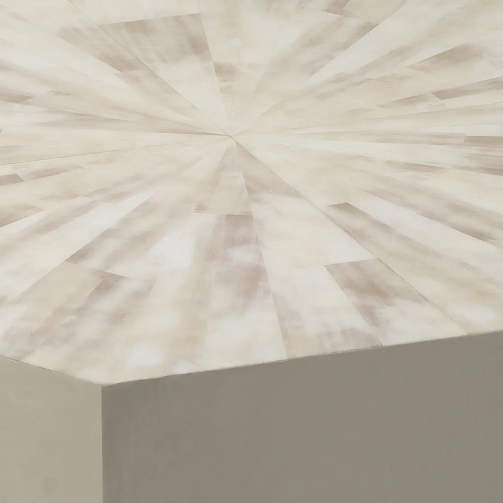 Inspired by the beauty of natural horn, our Radiant side table retains all the warmth and radiance of the organic material while being 100% cruelty free. To keep the intricate faux horn surfaces the star, they are paired with a simple gray lacquered interior and a sleek geometric shape.