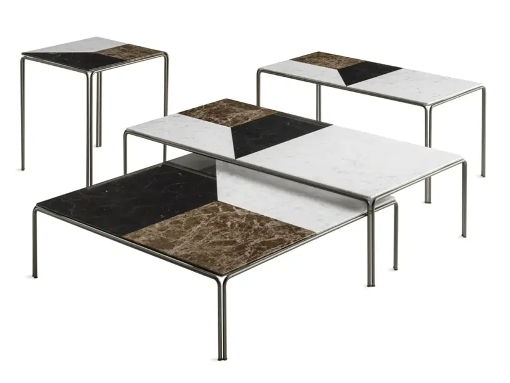 Ragtime is part of the accessories designed by Roberto Palomba and Ludovica Serafini to accompany their collection of Horm modular sofas. Structure in bronze painted metal. Top in Carrara, Emperador and Marquina marble.