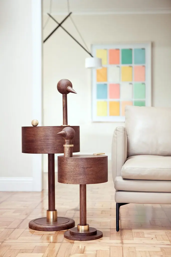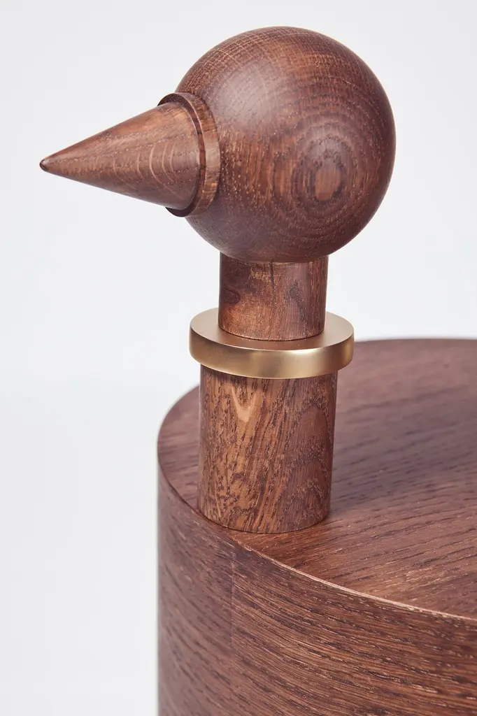 Rara Avis medium side table by EditiioLimited edition of 24 pieces, numberedMaterials: French oak and 24k gold plated steelDimensions: D 30 x H 64 cmRara Avis is the result of a dialogue between art and design. Miquel Aparici and Mermelada Estudio talked about finding a way to converge their works.As a result of that, they merged the characteristic work of Miquel into a collection of side tables.In order to achieve this goal, the artist explored different species of birds and then made 18 sculptures that Mermelada Estudio interpreted with their own language finding the balance between volumes, materials and proportions. Finally, they carefully selected the four fun birds that make up this elegant family of side tables.Created from the assembly of basic geometric shapes, they are handmade in Spain by master cabinetmakers who manufacture Spanish handmade guitars and by metalworkers who specialize in the production of art pieces. The first volume is made of French oak and 24K gold-plated steel.In 2012 working from the premise of excitement and fun, Mermelada Estudio decided to create “Editions”, a project that was born out of their need to express their most artistic concerns. It was a bold way of looking at contemporary luxury design through a collection of sculptural objects in a limited series which were made with care and delicacy using the highest quality materials available.Seven years later having gained a lot of experience, they decided to go back to the project and to their artistic roots but with a new, more mature approach. “Editiio” poses a dialogue between art, design and crafts.From the heart of Barcelona, the team gives free rein to all their interests and poetic ideas, combining this with the “savoir faire” of the best Spanish artisans, to create editions with personality that are exquisitely executed.The work of Miquel Aparici (Barcelona, 1963) is an extraordinary collection of animal sculptures, to which the artist gives life through assemblage techniques. He recycles objects in disuse and uses some beautiful antique pieces. His work is characterized by simplicity, since most of his pieces contain few elements. The end result is one of elegant compositions. His work has been exhibited in galleries around the world (New York, Miami, Copenhagen, Amsterdam, Freiburg, Madrid, Vienna and Milan, among others).Mermelada is an Industrial Design studio founded by Laura Blasco, Juanmi Júarez and Alex Estévez. The three met in Barcelona after years of training in design schools in Spain, England and Italy, and embarked on a creative journey with the common goal of finding the extraordinary in the ordinary. Since working together they have collaborated with companies such as Kettal, Rs, Fermob, Kvadrat, Moroso, BD Barcelona or Mexa among others..