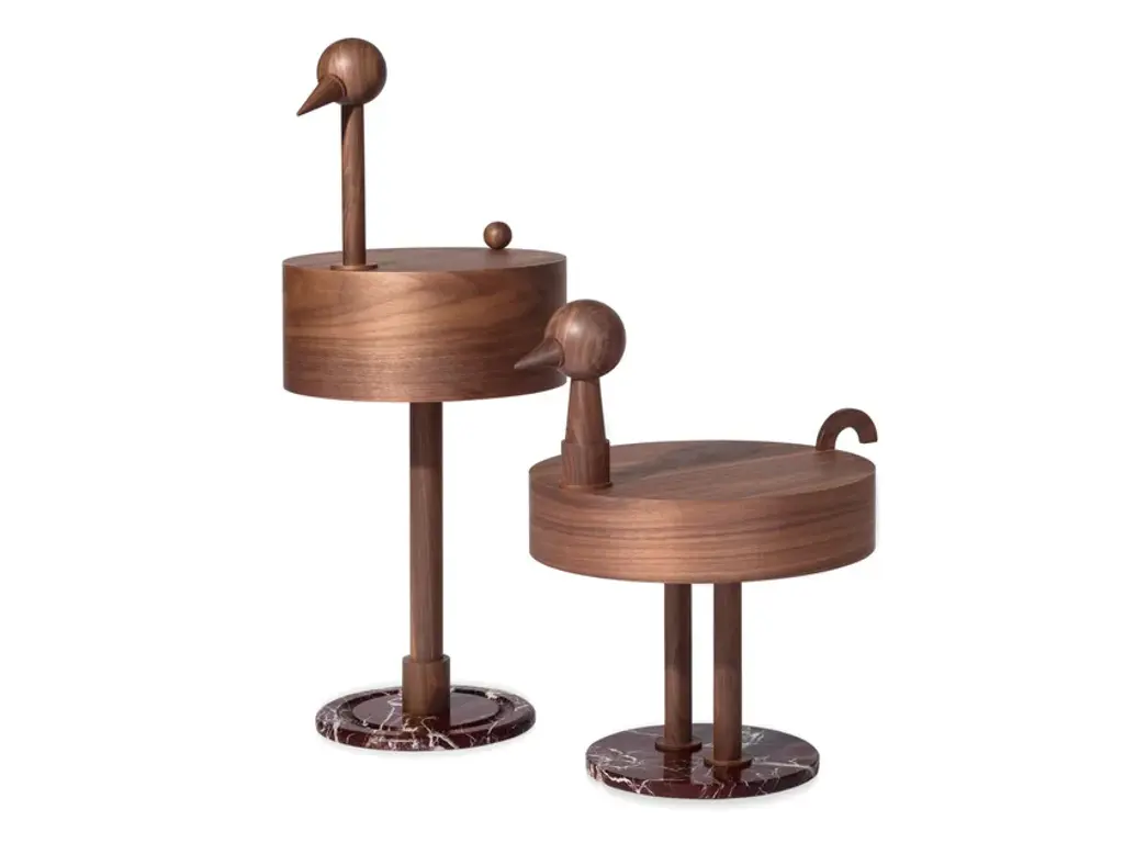 Literally translating its name from the Latin for “rare bird, Mermelada Estudio transforms an everyday object into an artistic statement-piece. An eccentric take on cubist style, the side table renders its geometric, avian-inspired shape in rich walnut with the flourish of a Rosso Levanto marble platform base. Beautifully crafted by Barcelona’s Nomon Home, it’s offered in dual sizes of differing heights — to place singly or in a whimsical pairing.