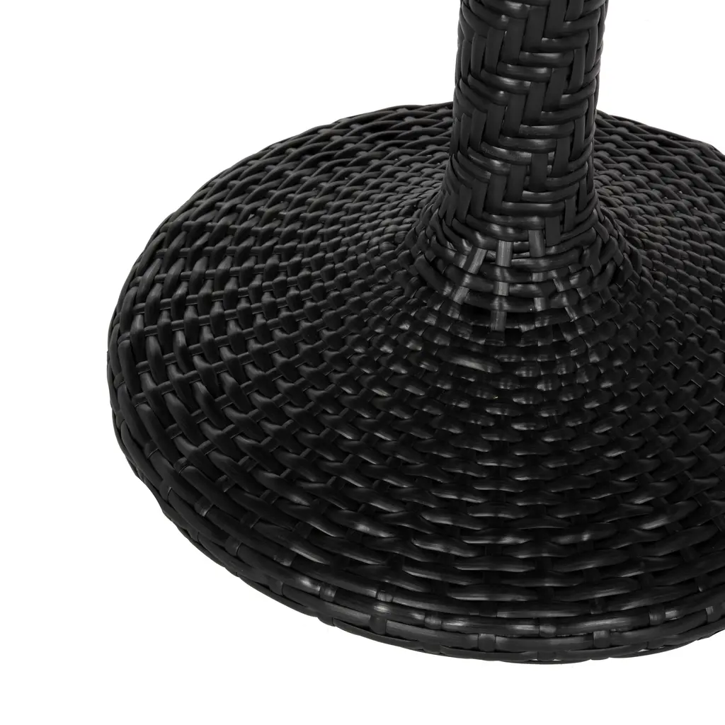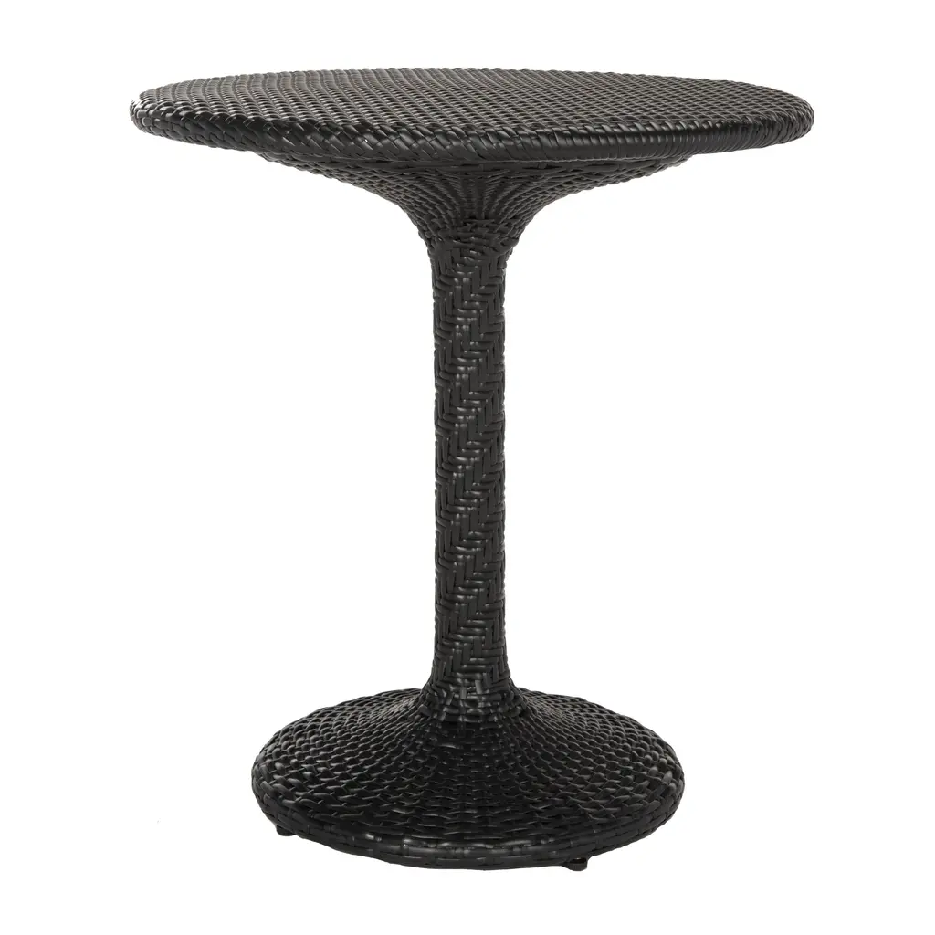Ideal for a romantic rendezvous, this contemporary rattan bistro side table is a must-have. Inspired by the classic French design, this modern update features a black hue and soft geometric design. Pair with matching chairs to complete the look. Store outdoor furniture indoors or cover well when not in use. Remove wooden furniture from standing water. Dust regularly with small brush or vacuum. Spills should be taken care of immediately before they harden or stain with a slightly dampened sponge. Do not use bleach solutions. Some assembly required.