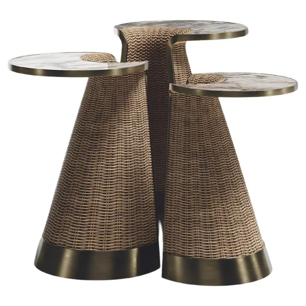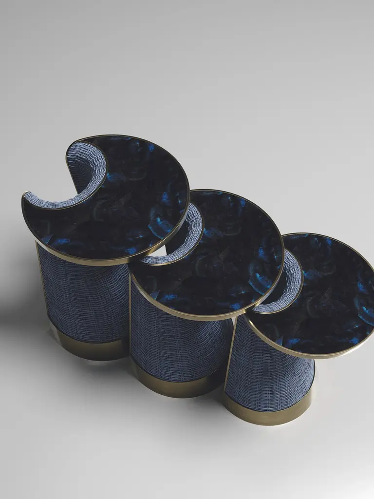 The Paris based label has distinguished themselves since their launch, with their iconic use of shagreen mixed with brass and other exotic materials. All furniture is handcrafted by skilled artisans, ultimately making each piece unique, designed in Paris and produced in the Philippines.The Nymphea Set of 3 Nesting Side tables by R & Y Augousti are a part of their new Rattan capsule launch. The pieces explore the brand's iconic DNA of bringing old world artisanal craft into a contemporary and utterly luxury feel. This set is done in a blue woven rattan finish, with blue pen shell inlaid tops and bronze patina brass details. This listing is for the set of 3 nesting tables, the pieces are available to purchase individually on separate listings. Part of the Augousti Rattan capsule, see images of the collection at end of slide. Custom sizing/finishing on request.Design SKU reference: NT20The dimensions of these pieces are:Side table L - 41.4 x 60.3 cmSide table M- 37.9 x 55 cmSide table S- 34.5 x 50 cmAll R & Y Augousti pieces are handmade by artisans, ultimately making each piece unique.Acclaimed design duo Ria & Yiouri Augousti have established themselves since the 1990s as pioneers of modern-vintage style through their luxurious Art Deco inspired collections.The Paris based label has distinguished themselves since their launch, with their iconic use of shagreen mixed with brass and other exotic materials. All furniture is handcrafted by skilled artisans, ultimately making each piece unique. All shagreen-covered items should be kept out of direct sunlight, color variants may occur on the stingray and other exotic finishes, but this showcases the Parisian label's commitment to creating authentic luxurious products using natural components.Wipe clean with soft dry cloth.