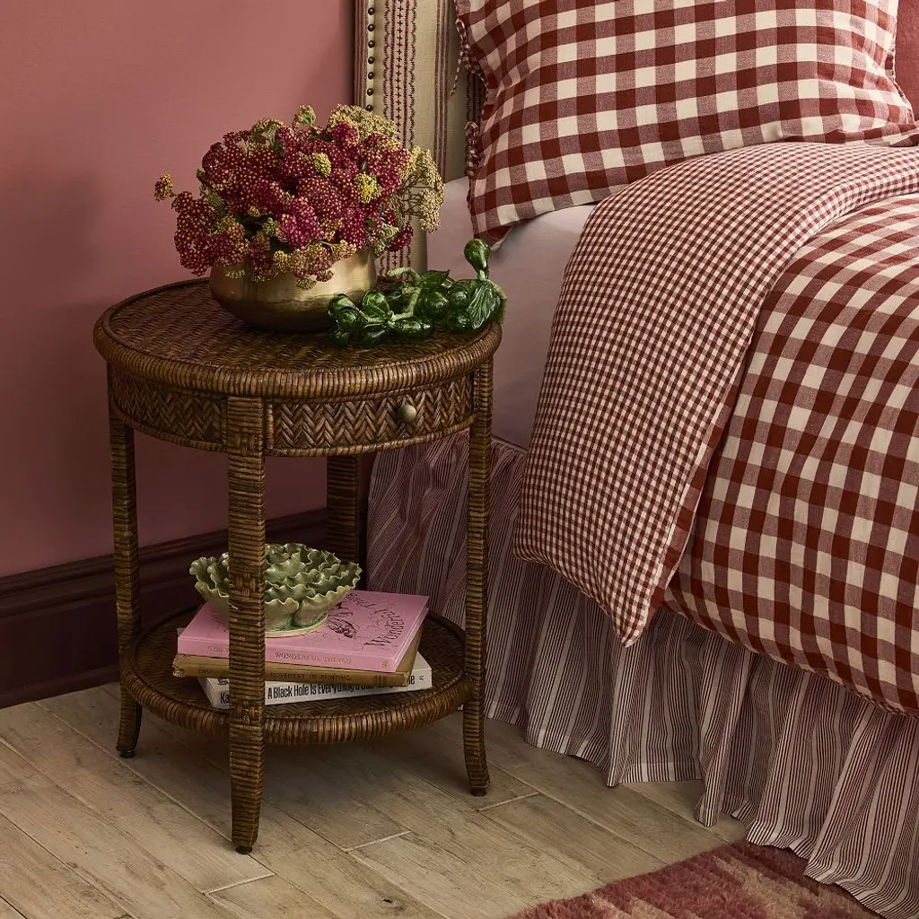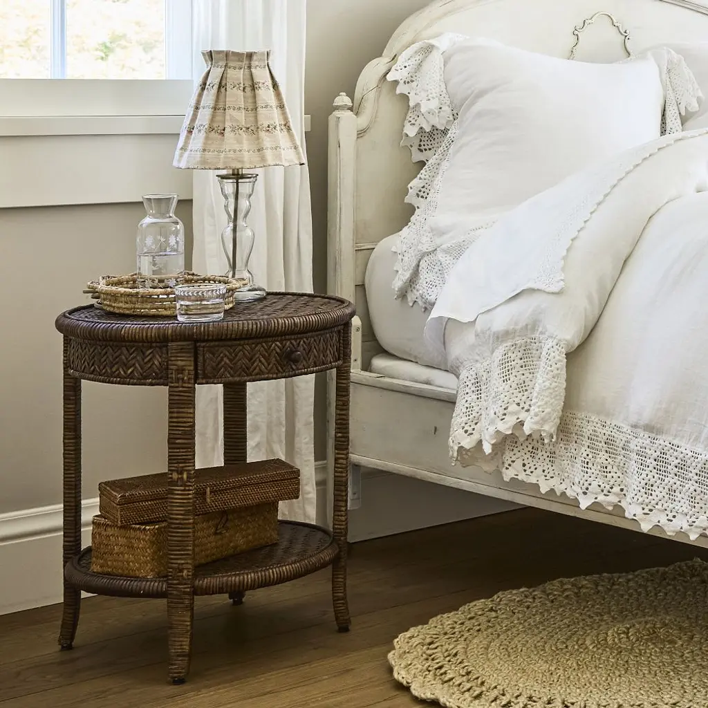 Well rounded. An easy fit in living rooms, bedrooms, and beyond, this espresso-finished side table features tapered legs, a compact drawer, and open shelf. A classic wicker weave wraps around a rattan frame.