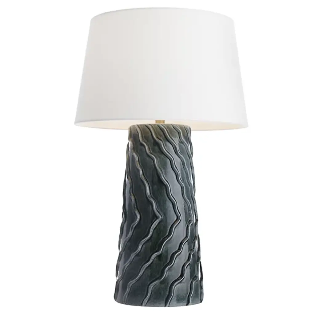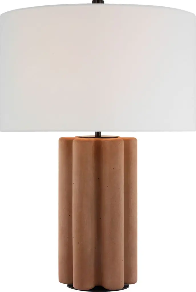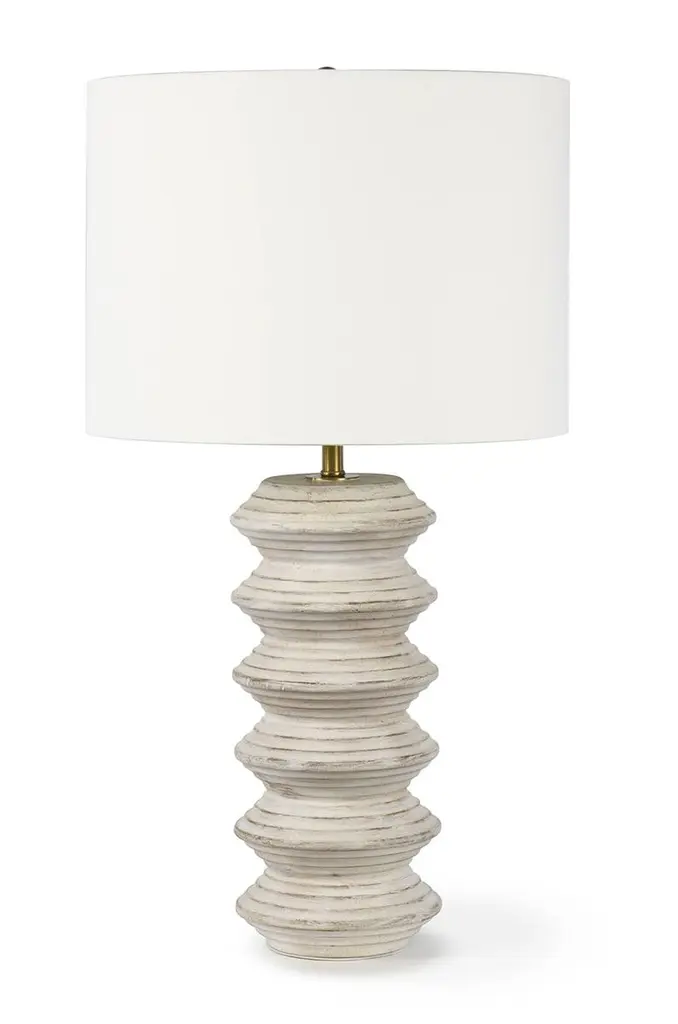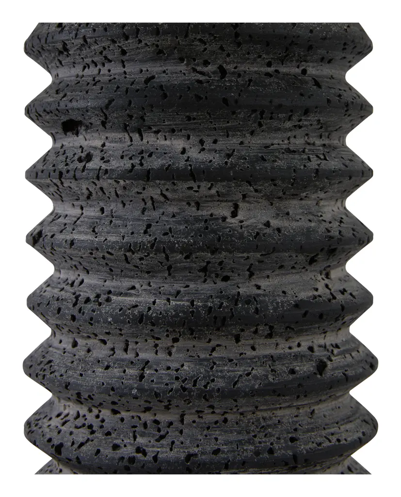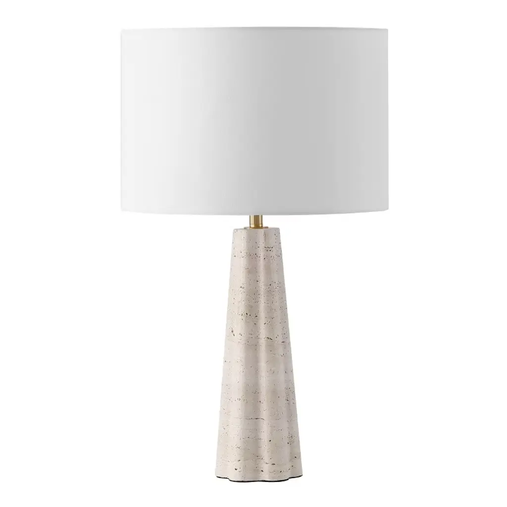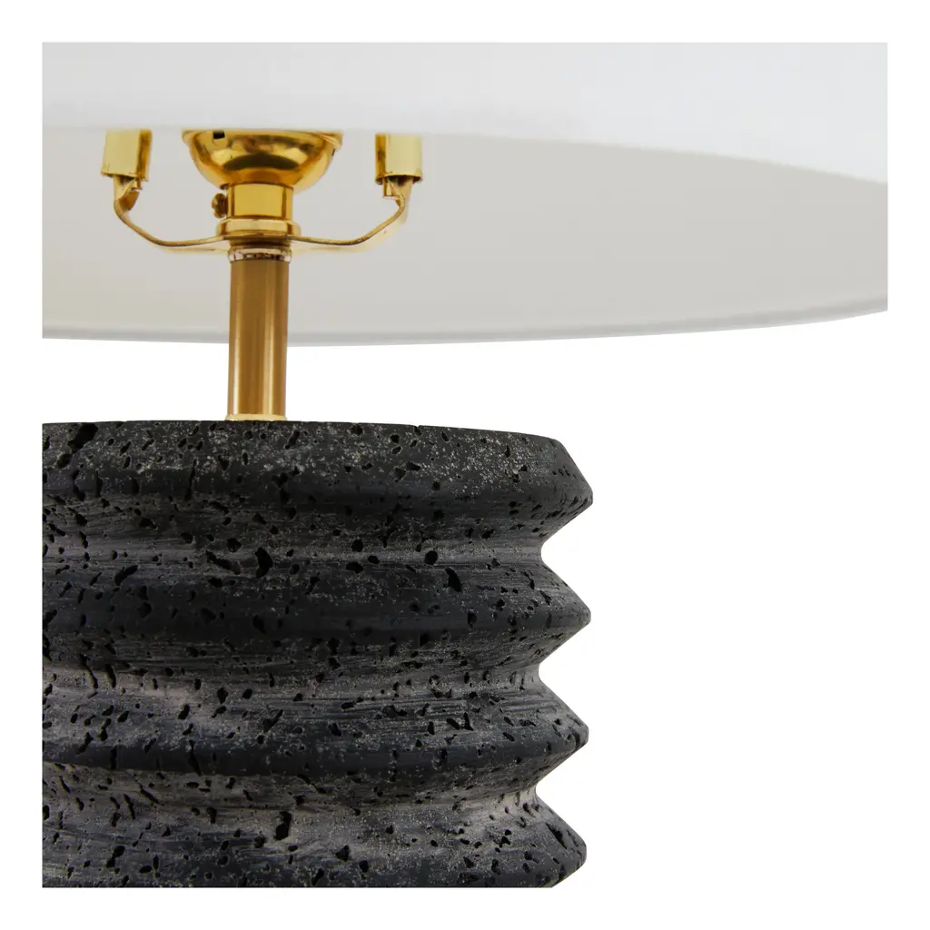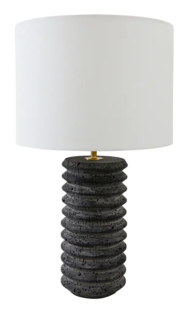 Brighten things up with our organic-modern Ravine Lamp. Striking in design, Ravine features a cylindrical base crafted from porous black travertine stone and carved into a grooved, accordion-like shape. We’ve paired it with a simple white linen drum shade, which adds a bit of structured contrast to its otherwise unique and earthy aesthetic. Perfect for adding a touch of tactile texture to any room of the house, we love Ravine illuminating a living room end table, adding some welcoming warmth to an entryway console or as a pair adding a pop of dimension to the bedroom nightstands. •13" diameter x 22.5"H •base: 5.5" diameter x 11"H •shade: 13" diameter x 9.5"H •black travertine stone •white linen shade •3-way cast turn knob •black fabric cord •requires 150W max/type A bulb