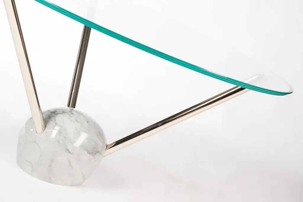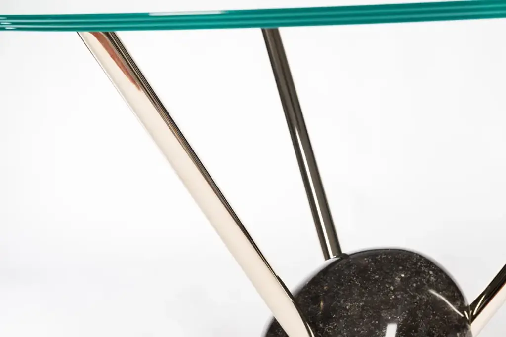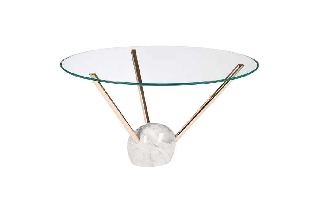 Rays is a round table with 4 mm tempered extra clear glass top, marble base and galvanized metal arms in 24 kt gold finish.Part of unNatural Collection by Giorgio Ragazzini, stems from an investigation into natural phenomena and from the interaction of materials with human technology. 100% Made in Italy