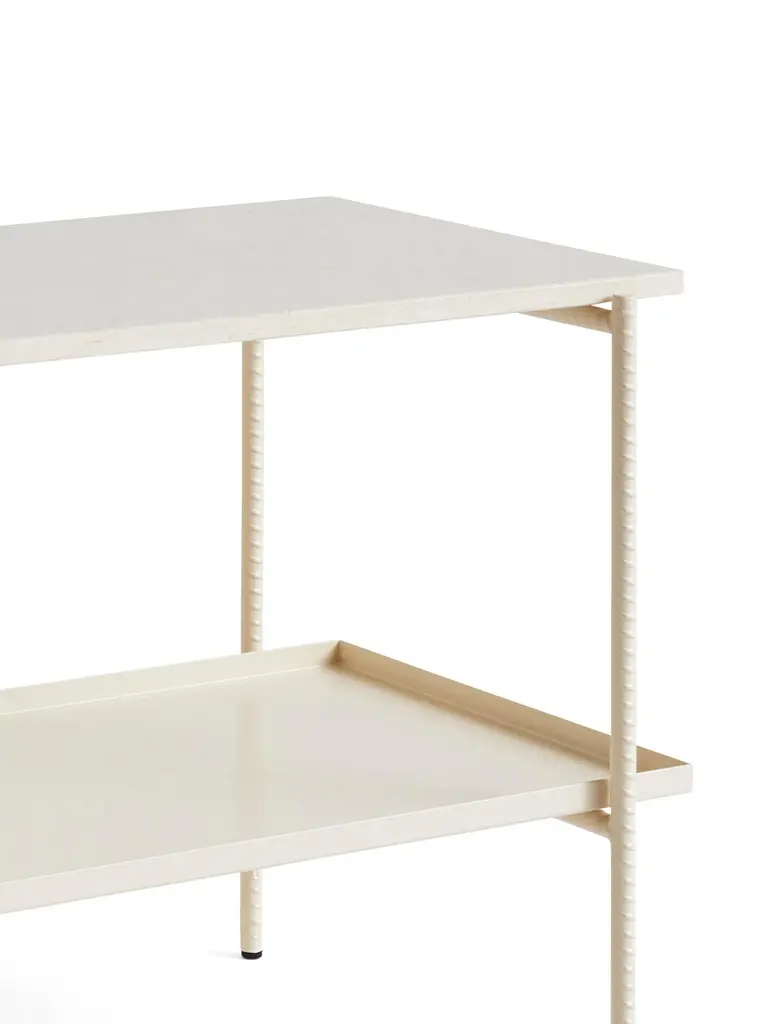 Sylvain Willenz’s Rebar tray table having a design that juxtaposes the reinforced steel bar frame with black marble tops and metal trays to create a balanced aesthetic. The table is suitable for using in private, corporate or public spaces.Dimensions : Length (L): 75 cm / 29.53 inches Width (W): 44 cm / 17.32 inches Height (H): 55 cm / 21.65 inchesWeight : 29,7 kgTabletop : Beige Crema Diva MarbleFrame : Alabaster Powder Coated SteelTray: Alabaster Powder Coated SteelDesignerSylvain Willenz is a well-travelled designer from Belgium who established his own studio in Brussels in 2004. He is a graduate of the MA Design Products course at the Royal College of Art in London (2003). His design office has won several iF Awards and the Red Dot “Best of the Best” Award in Product Design, he was named Belgian Designer of the Year in 2009 and he regularly works in education for institutions such as ECAL and ENSAV La Cambre. Willenz is a particularly inquisitive designer, immersed in the language of products and industrial process. His work spans various typologies and is often inspired by graphics, drawings and other 2D sources - his desire is to create elegant and clean designs that are both unfamiliar and familiar. For HAY, Willenz has designed Rebar Collection and Pyro Coffee Table.