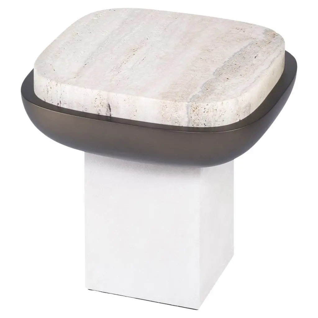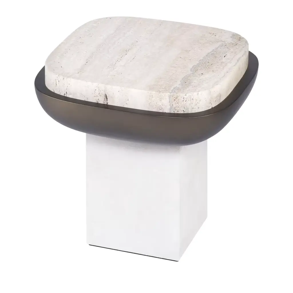 Contemporary rectangular travertine & leather side table - olympia by Stephane Parmentier for Giobagnara.The object presented in the image has following finish: Travertine top, A24 smoke suede leather (base) and bronze-laquered wood seat bowl.Showcased in a private study, living room, or lounge, this exquisite side table boasts a captivating mix of textures and materials in a minimal silhouette that pays homage both to Oscar Niemeyer’s sensual architecture and traditional Oriental architecture. Handcrafted of solid wood, the column leg is covered in taupe suede (also nappa and printed calfskin) and supports a bronzed-lacquered seat topped with a slab of prized Travertine marble. This piece can be displayed either as a statement piece or combined with the other pieces of the Olympia Collection.Design: Stéphane ParmentierMaterial: Travertine top, golf, suede or nappa leather (base), bronze laquered wood seat bowl.Dimensions (in): W 25.39 x D 17.52 x H 17.13Dimensions (cm): W 64.5 x D 44.5 x H 43.5Made by hand, in Italy.This item is made to order. Please choose the finish that you want for your piece.