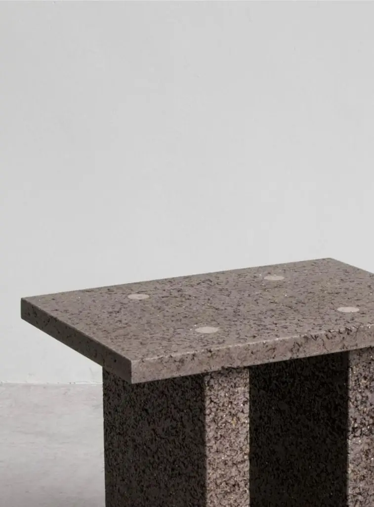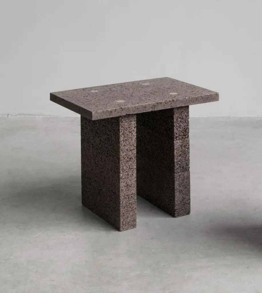 Recycling Reject side table by Tim TevenDimensions: 47 x 34.5 x 43 cmMaterials: Recycled CompositeAvailable in different colors.Recycling Reject demonstrates the possibility of using the non-recyclable fibers as a building material by pressing them into a hard solid. The end result is a strong, stone-like material. This adds another product cycle to the raw material cellulose fiber. The new material can be used to build several pieces of furniture, with a unique look and functional aesthetics.Tim Teven (1993), a dutch designer, graduated from Design Academy Eindhoven in 2018. A technical and material-driven approach to design together with a hands-on way of working allows him to play and create in an experimental way. In many of the works, the production process is used as a tool to design and a leading aspect to shape the final outcome and function of the object. Treating materials in an unconventional way to rethink the process of making, allows him to find surprising techniques which then can be translated into a functional yet interesting object. Teven works from his design studio based in Eindhoven founded in 2018, where all the objects are hand-made with industrial craftsmanship.