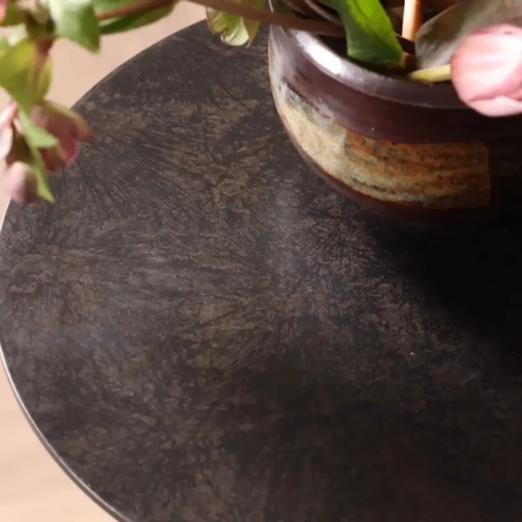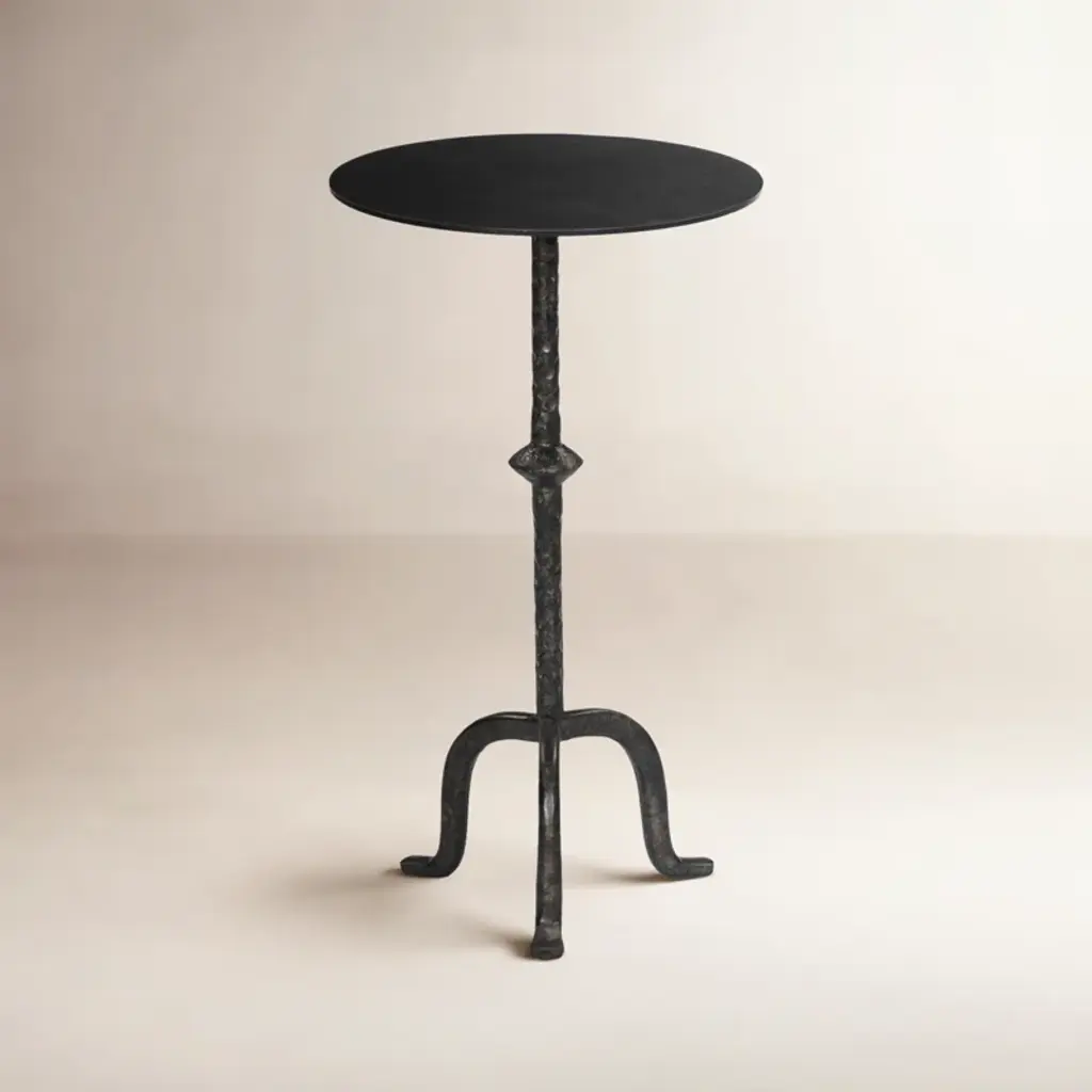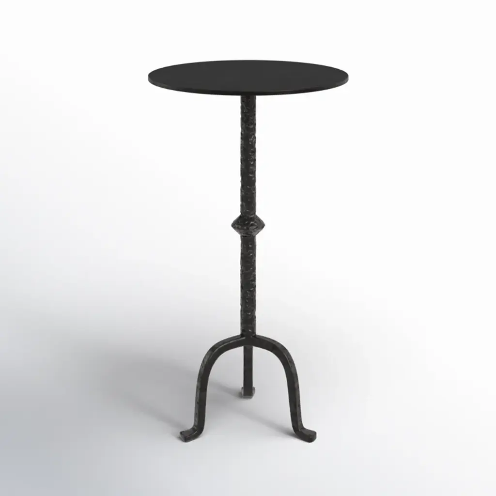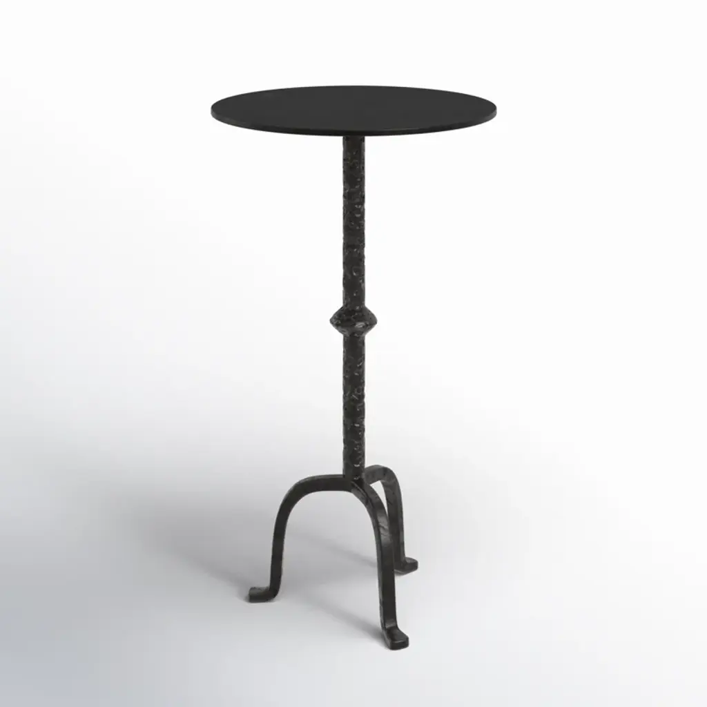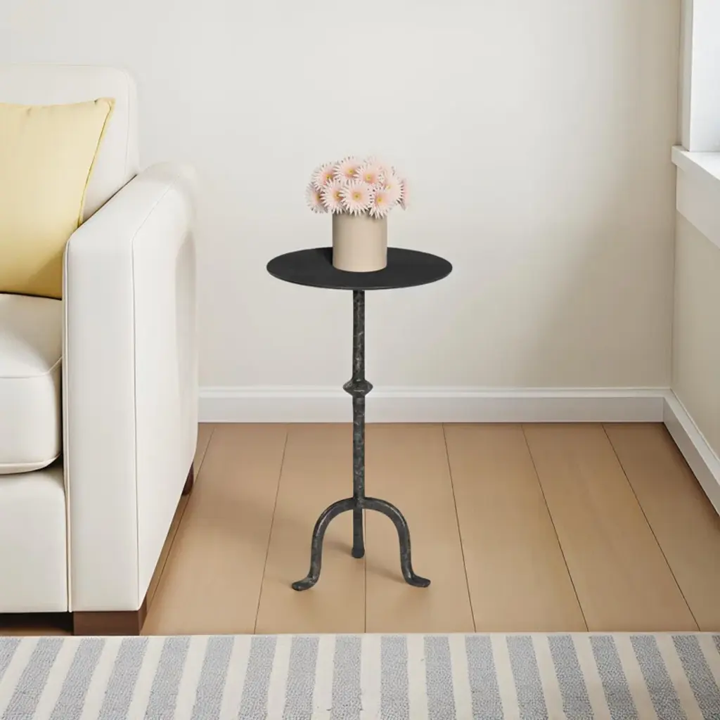 Textured black cast metal forms a turned post atop three curved legs, for an antiqued metalwork look. A round top completes this versatile accent, bridging heritage and contemporary styles.