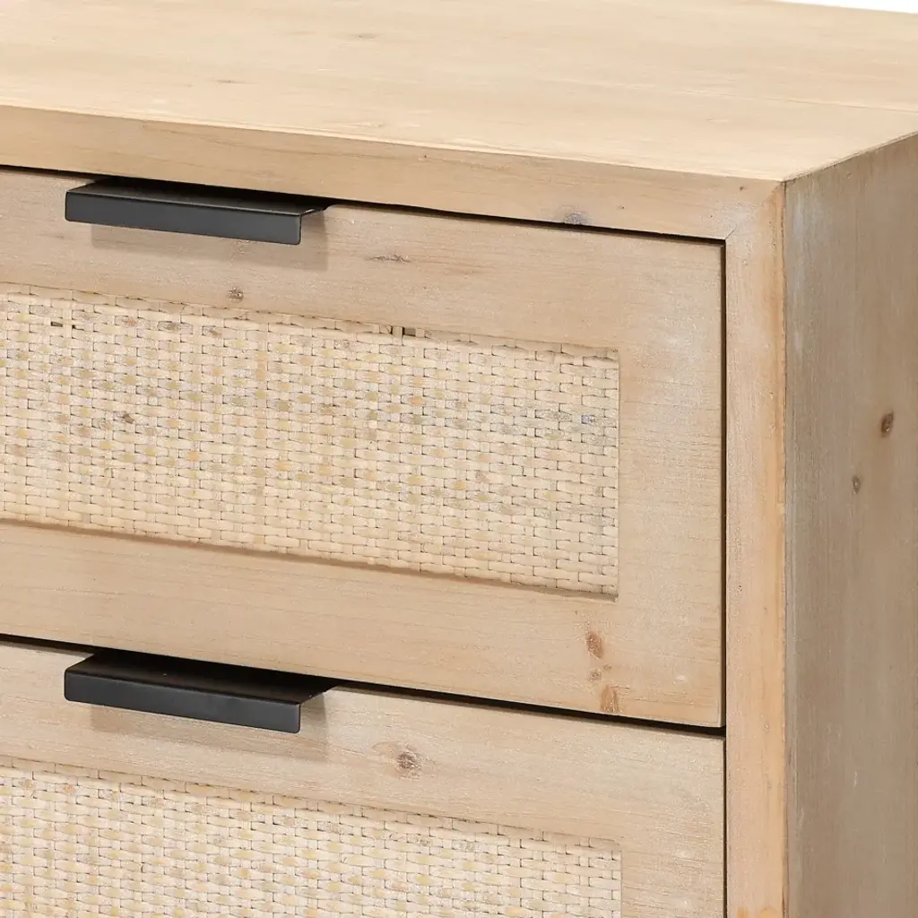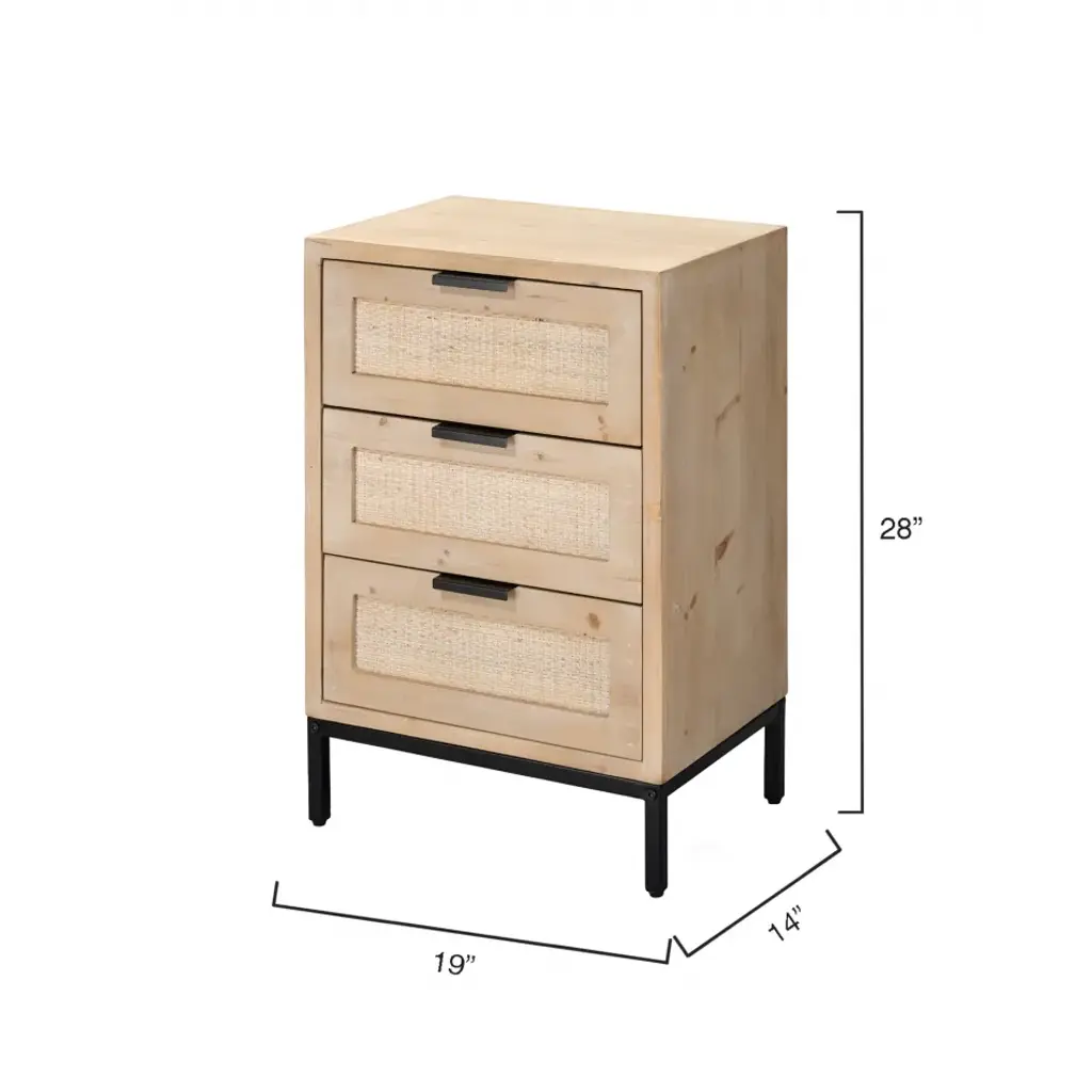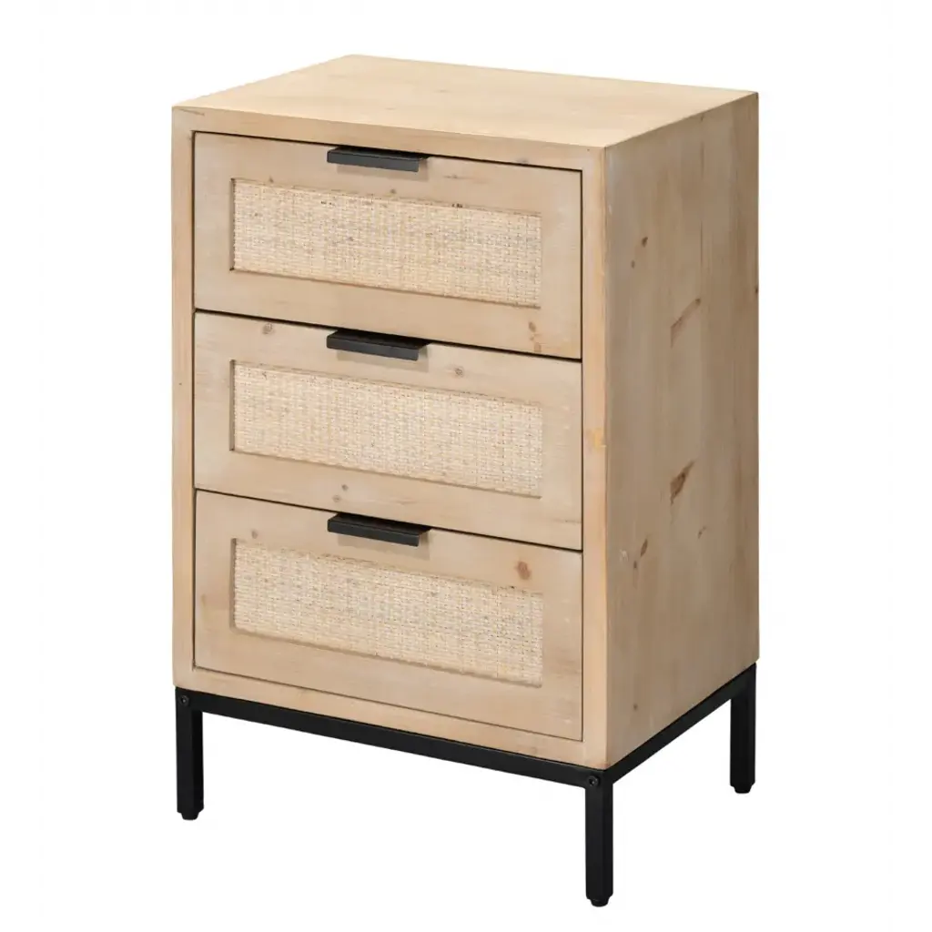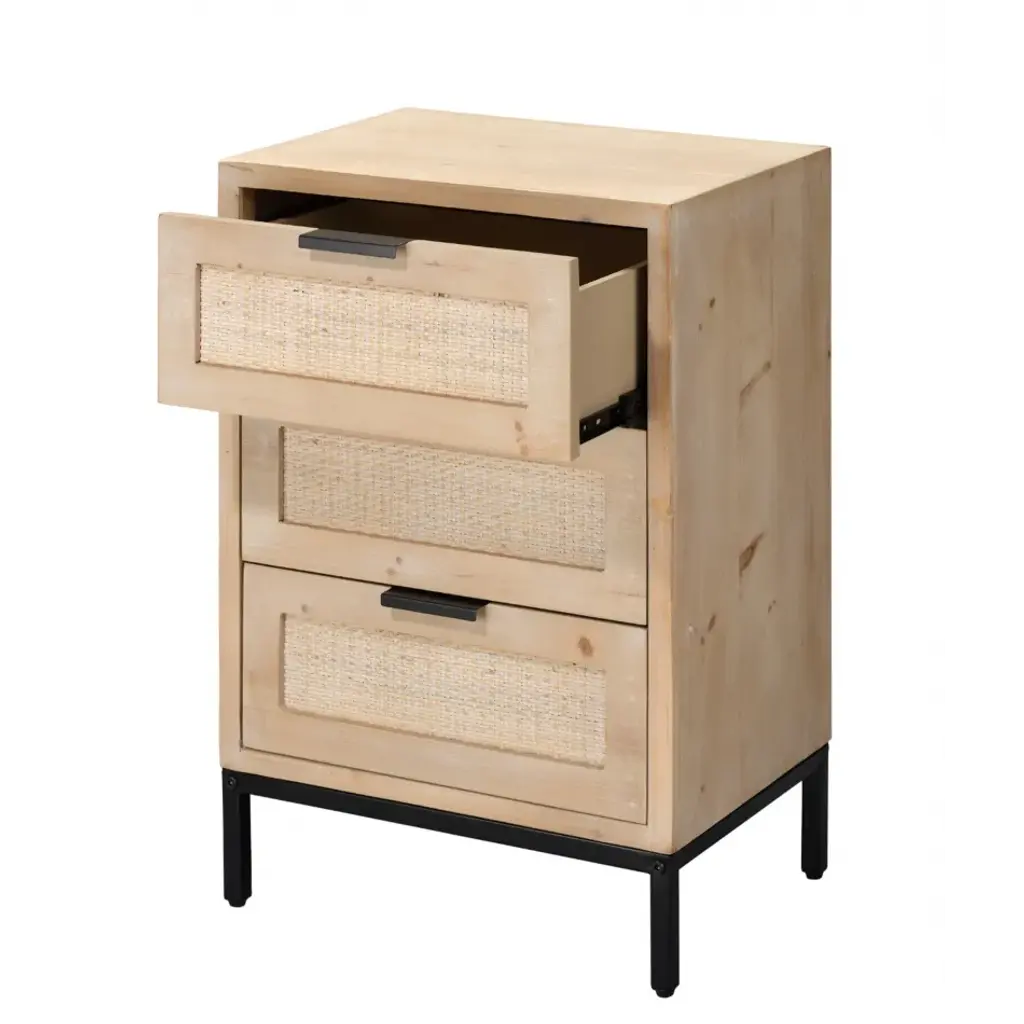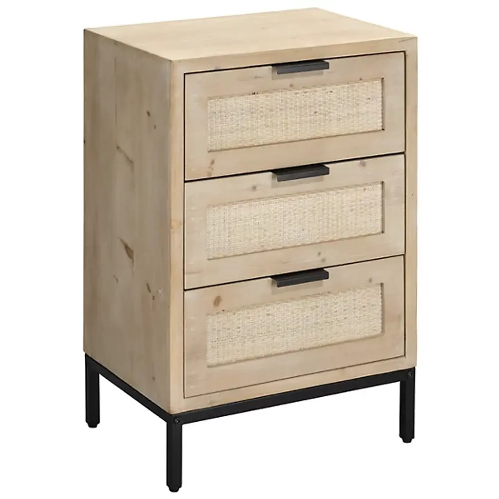 Natural materials meet modern functionality in our clean-lined side table. Crafted of an eye-catching mix of wood, iron and rattan front panels, this table offers organic appeal and rich textural dimension. Place next to a couch, accent chair or your bed for stylish storage of nighttime essentials.