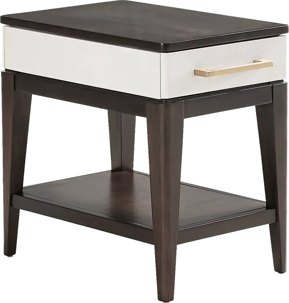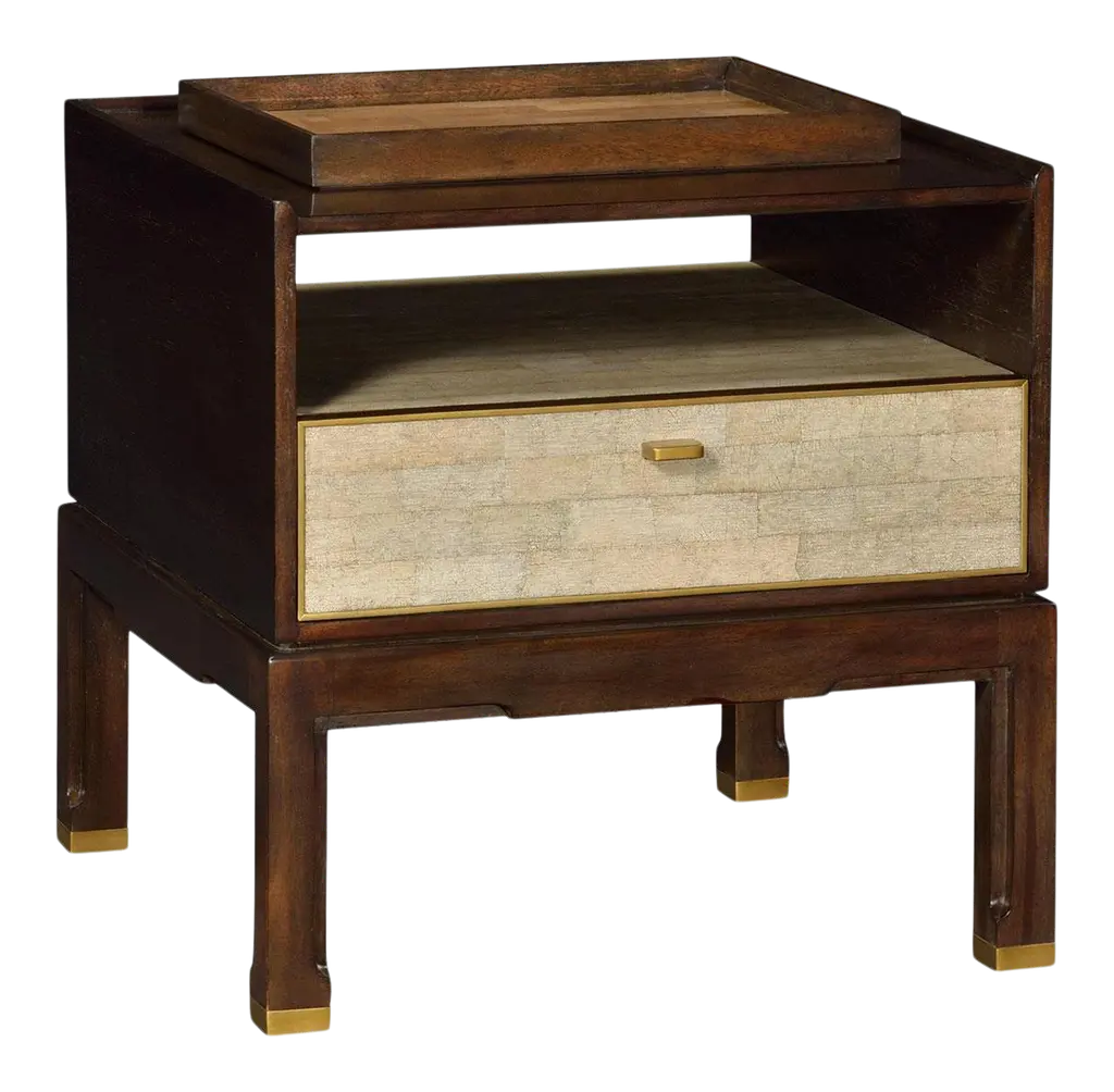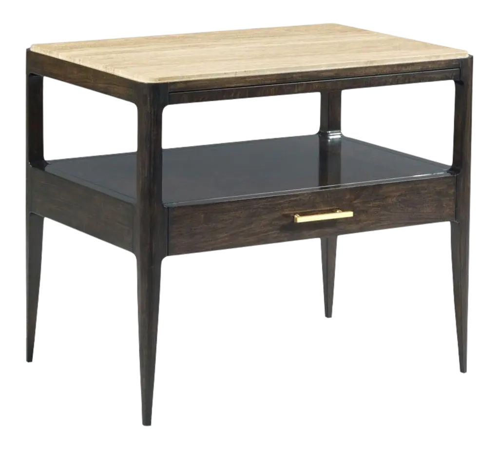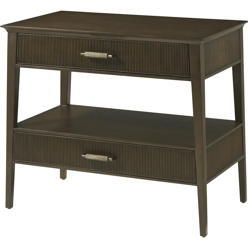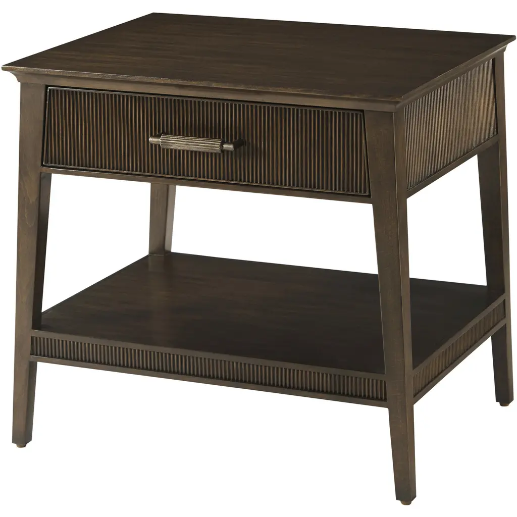 This rectangular end table includes two shelves with one drawer. The drawer features a reeded facade which coordinates with the cocktail table, chest and étagère. Brass hardware is included.