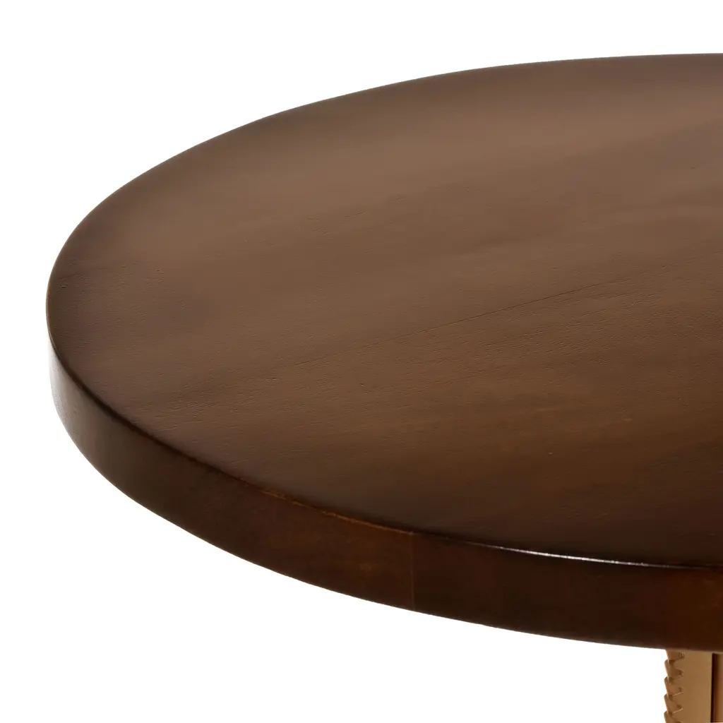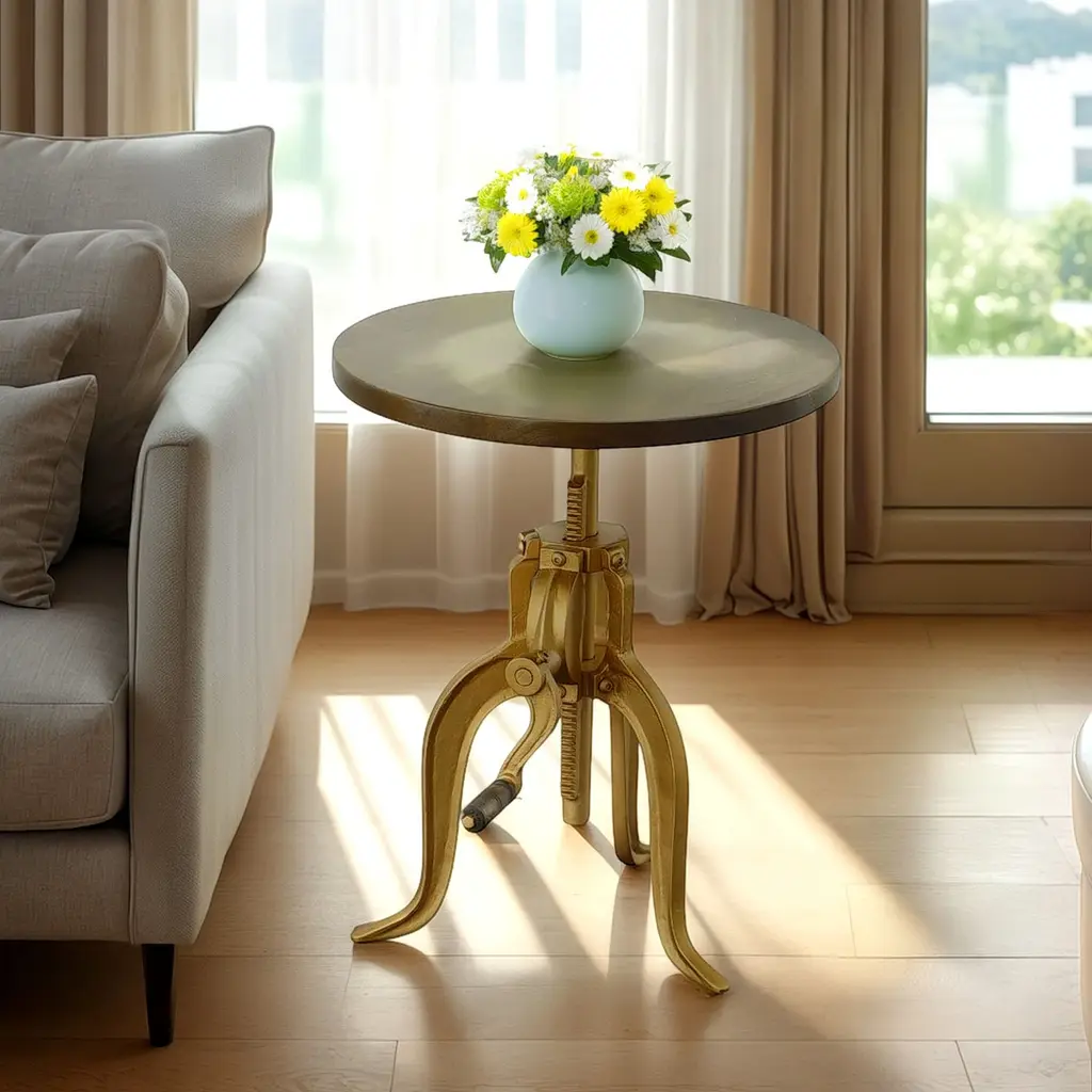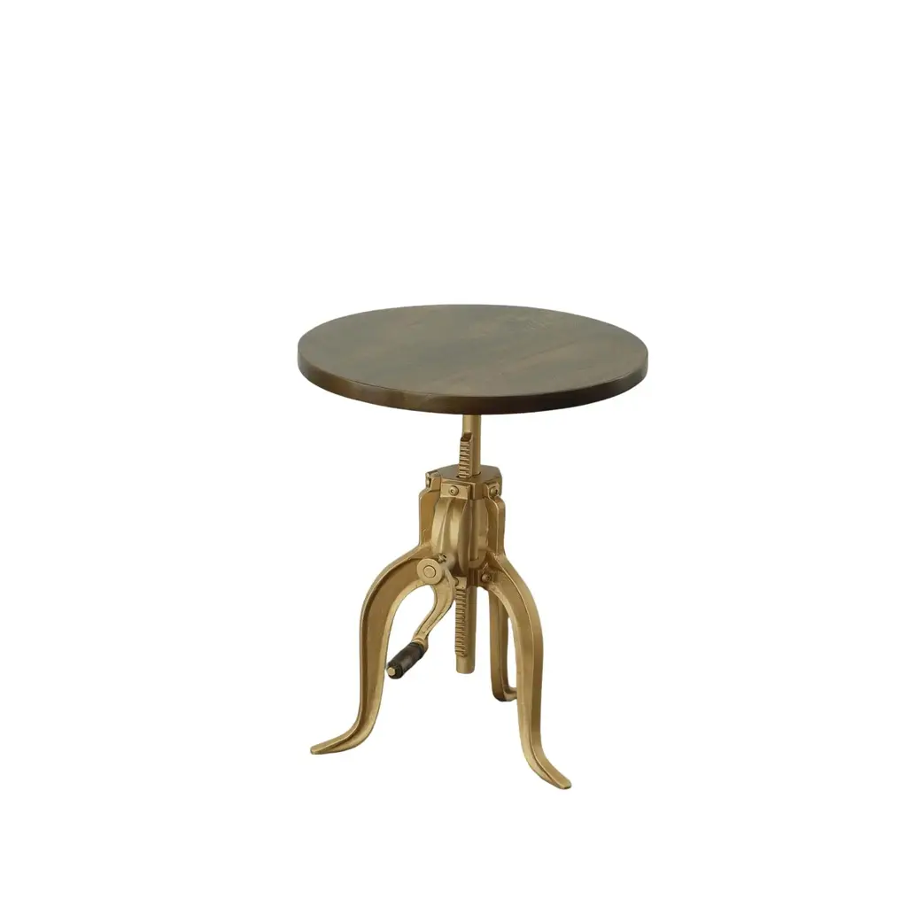 Add character and function to any space with our Regan Adjustable Accent Table—a striking blend of vintage charm and mechanical flair. Featuring a round mango wood top in an elm finish paired with a sturdy cast iron base, this table’s real showstopper is the working hand-crank that adjusts the height to suit your space and needs.Inspired by early industrial machinery, the iron base boasts sculptural curves and solid strength, while the wood top brings warmth and contrast to the design. Use it as a side table, plant stand, or unique nightstand—it’s as versatile as it is eye-catching. Perfect for farmhouse, rustic, or loft-style interiors, this table brings a bold, functional accent to your home.