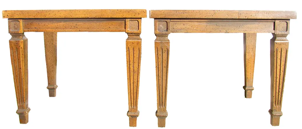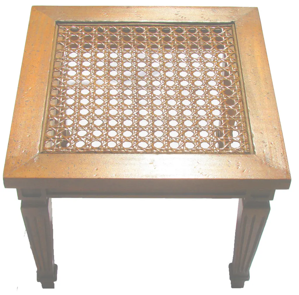 Handsome pair of mid-century wood side tables with woven cane tops and fluted legs in a medium pecan stain with light flyspecking which gives the finish depth and character . A great edition to any living space. Use as presented or add a piece of glass inside the frame on top of the cane, if desired. No maker's marks. Dimensions: overall, 18"W x 18"D x 15"H; cane inset, 13.75"W x 13.75"D. Very good vintage condition' no cane breaks, minimal finish wear.