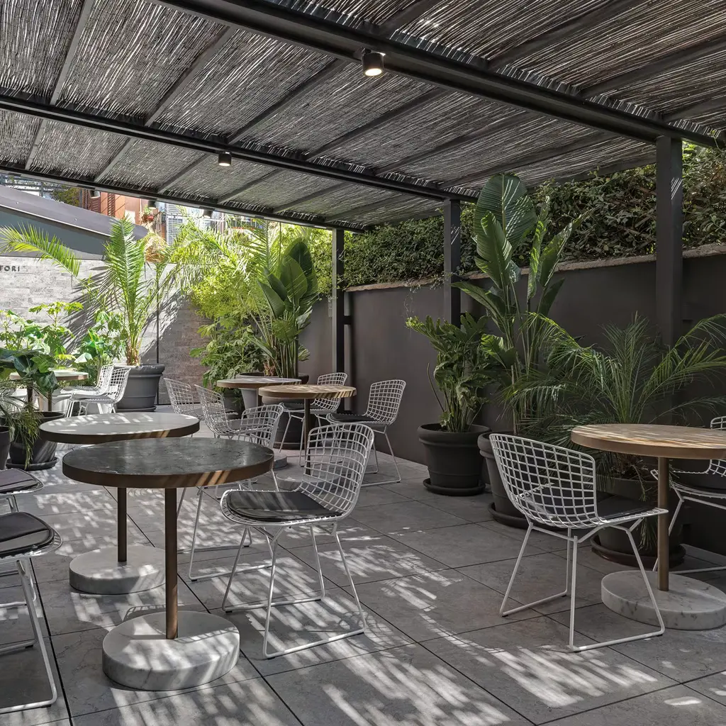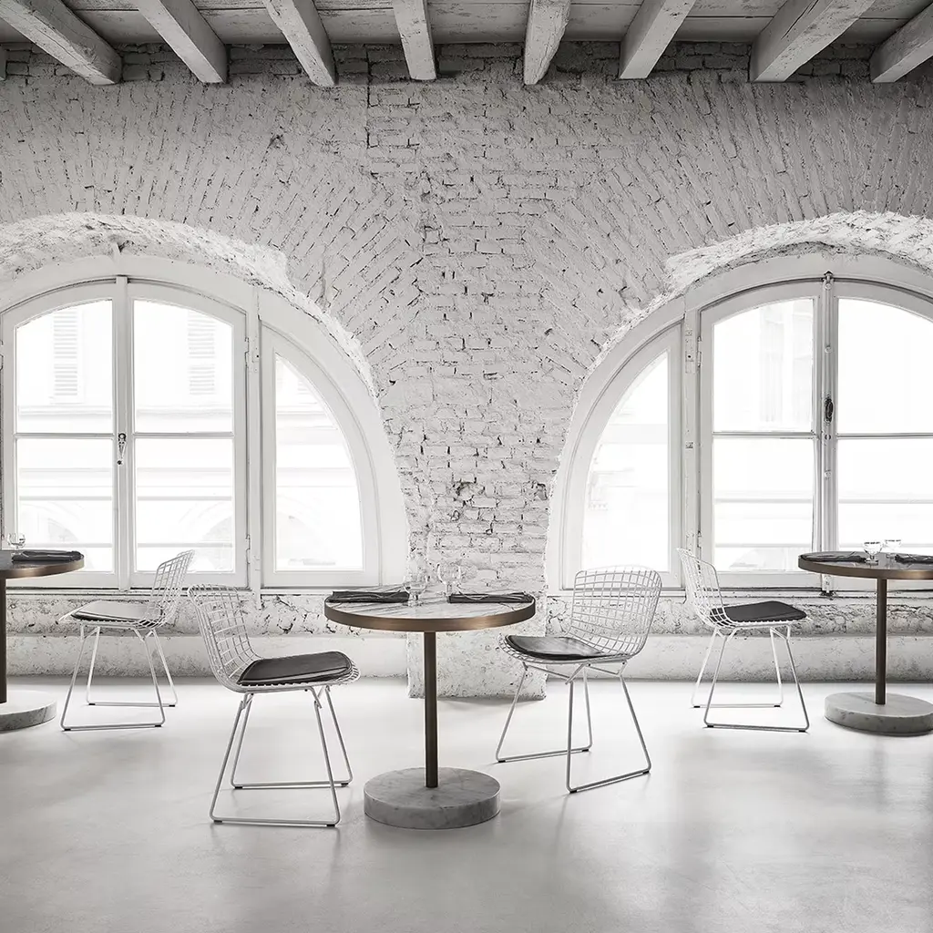 The René Bistrot Tables feature a timeless marble top, shown here in Nero Marquinia, a heritage stone that is no longer quarried, shattered into a constellation of stone shards sealed together with a luminous gold seam. Lissoni borrowed the technique from the Japanese art of Kintsugi, a method of repairing broken ceramics that considers its cracks as part of its life cycle.