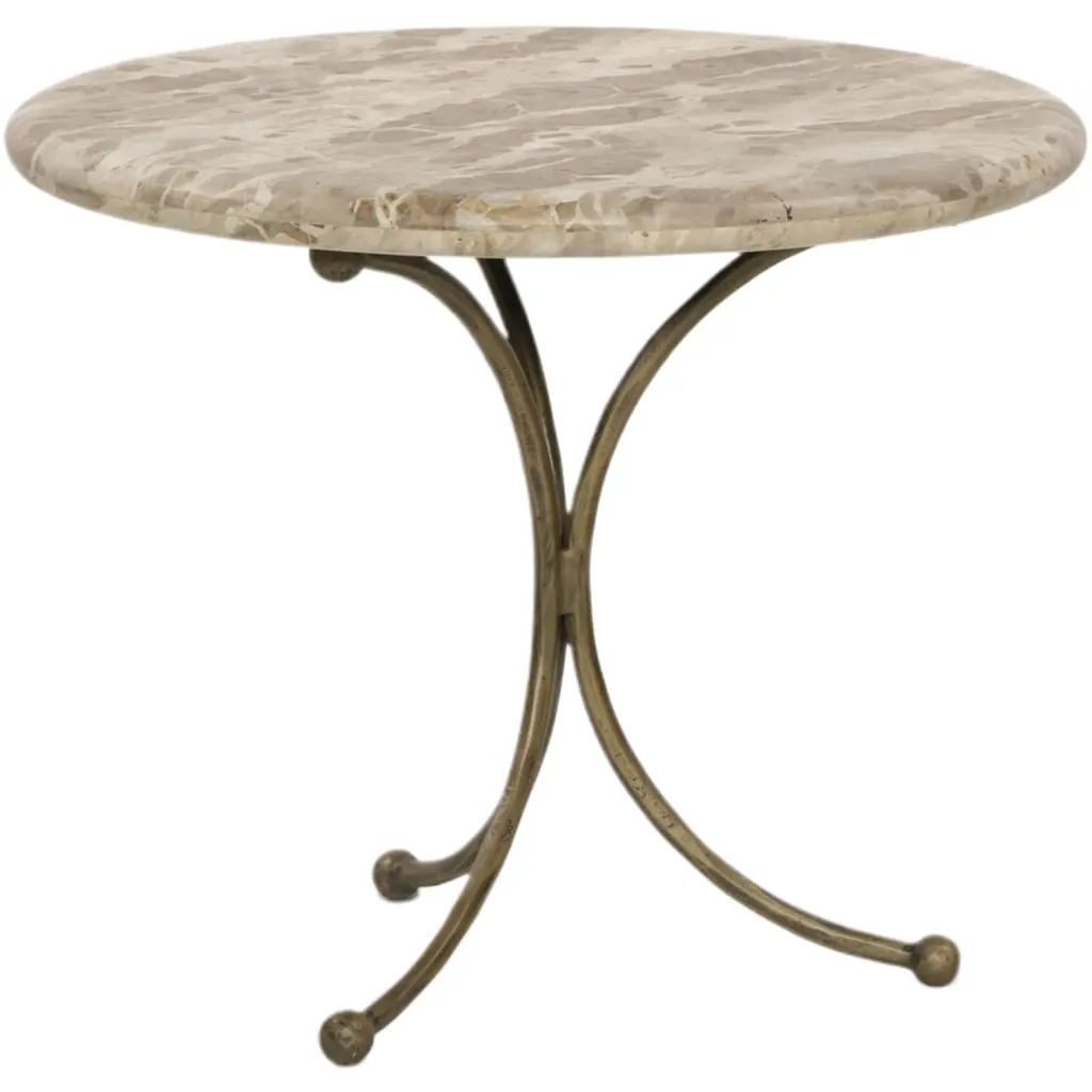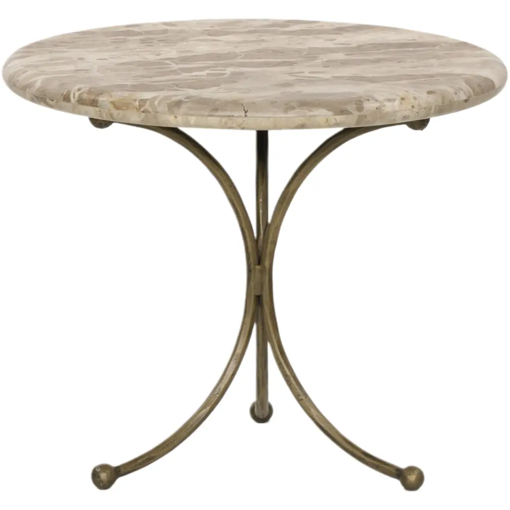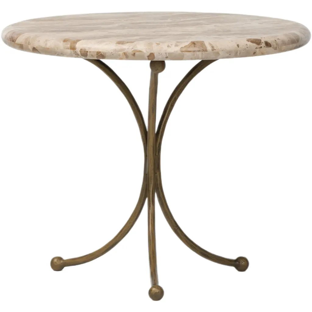 The Renin End Table - Fossil Marble is a stunning piece that combines elegance with modern design. Its tulip-shaped base, crafted from aged brass, features intricate ball details that add a touch of sophistication. The tabletop, made from rounded fossil marble, is accentuated by bullnose edges, creating a soft and inviting look. This end table is a perfect blend of form and function, making it a standout addition to any living space.