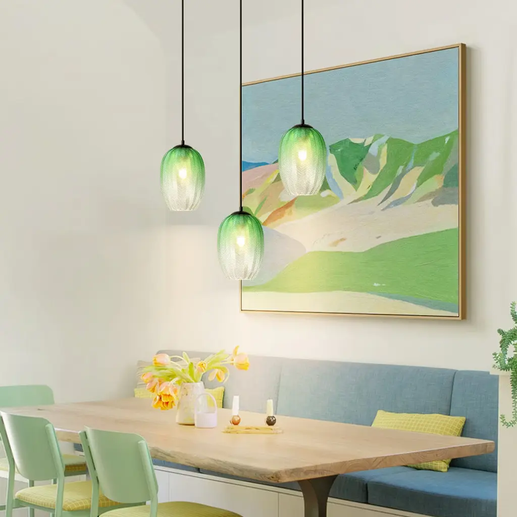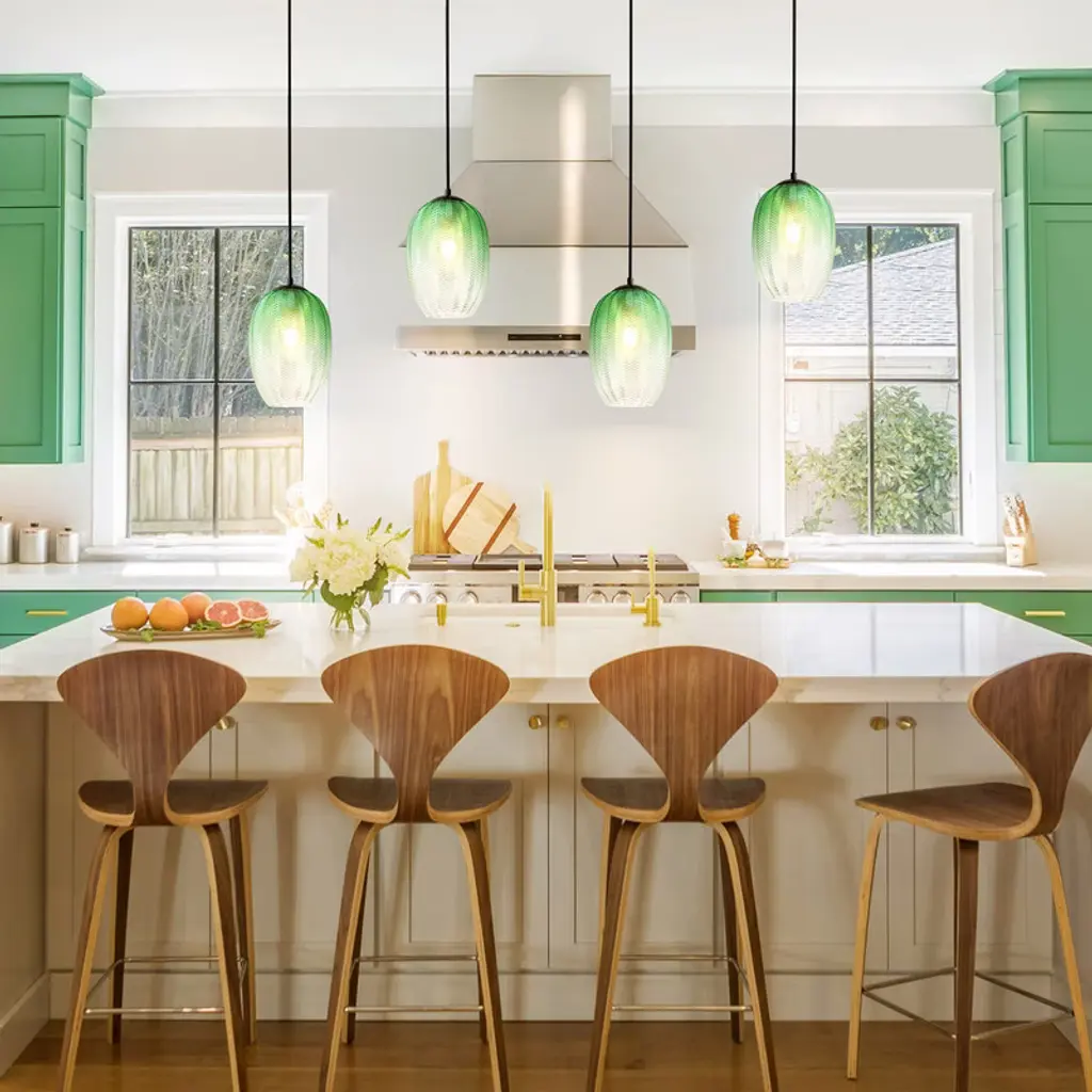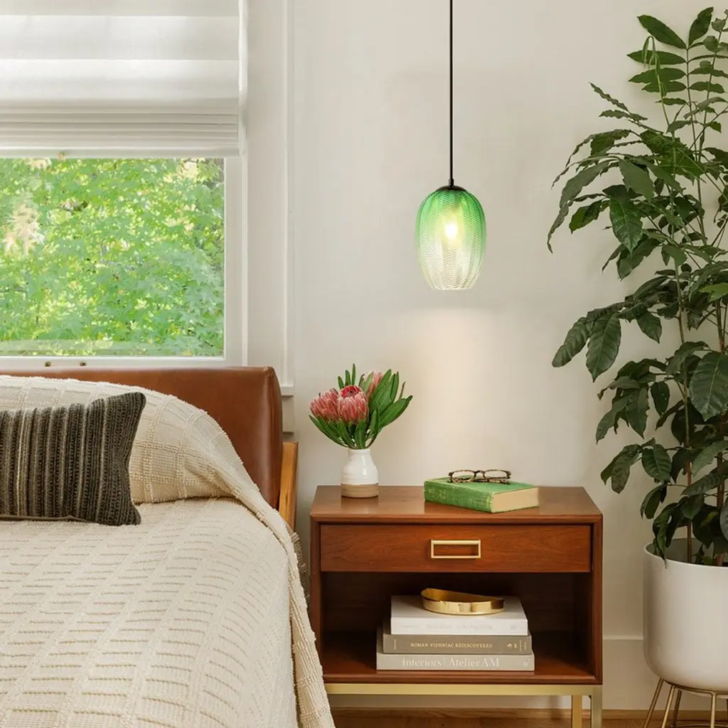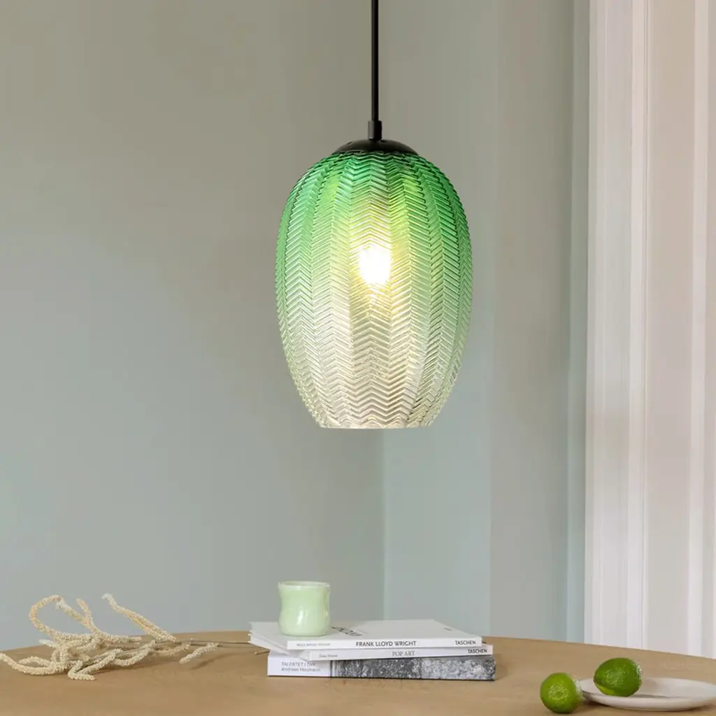 Bring nature-inspired elegance into your space with this single-light pendant featuring a buded tulip shade in green textured glass. Its softly pleated form mimics a blooming flower, creating a sculptural statement even when unlit. Perfect as a standalone piece or clustered in staggered arrangements above kitchen islands or bedside tables. Easy to install with all hardware included and dimmable to suit any mood, this 7" pendant fits a standard E26 base 60W bulb (not included), blending function and decorative charm seamlessly.