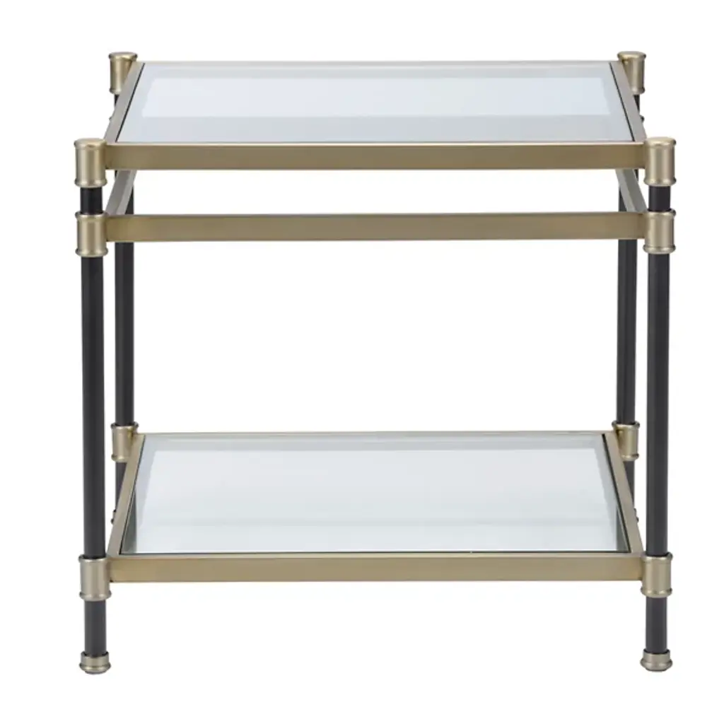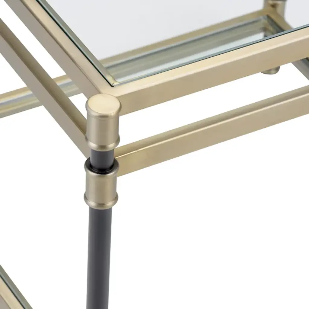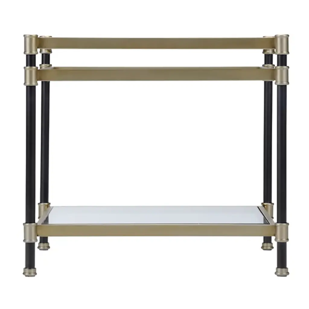 The Reynolds Side Table from Wildwood combines industrial materials through a framework of matte black and brushed gold stainless steel tubing. Two square glass shelves provide transparent storage that keeps the focus on the contrasting metal framework below. The dual-tone finish treatment creates depth through color variation, with the black sections grounding the piece while gold accents add warmth and luxury. This side table demonstrates how strategic color placement can elevate utilitarian materials into something more refined, with the glass shelves maintaining openness throughout the design.