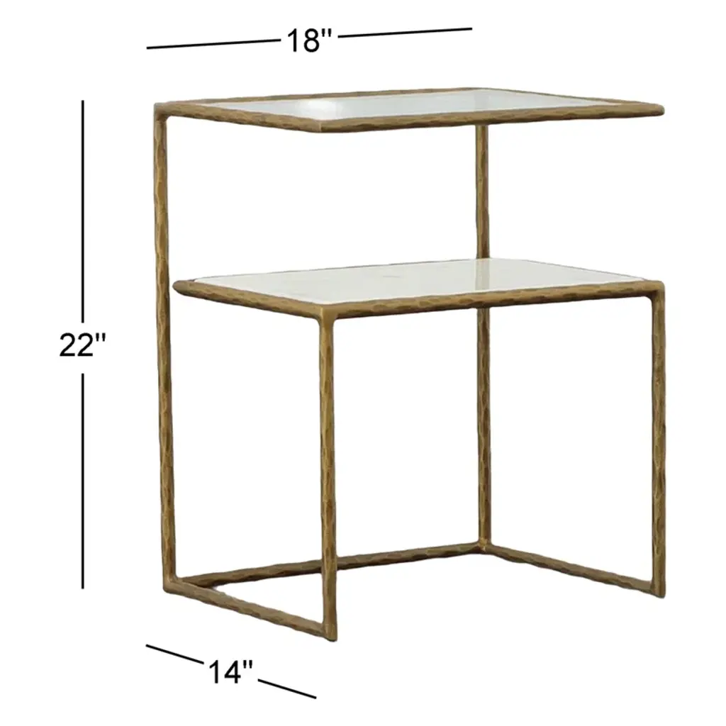 Cleverly geometric styling is the hallmark of this unusual and striking side table. The gold-toned hammered metal frame supports two shelves; the lower is marble, while the upper is clear glass. Not just a side table, this beauty is the jewelry for your stylish room.