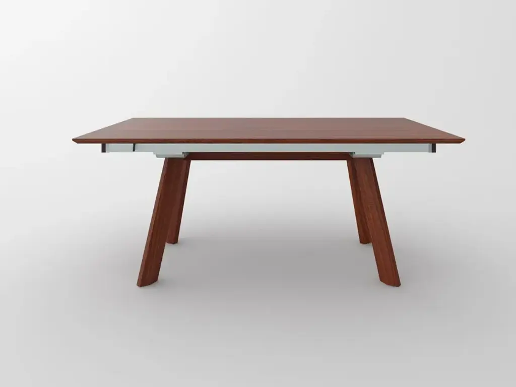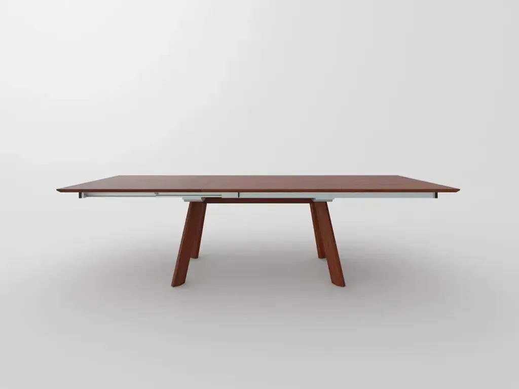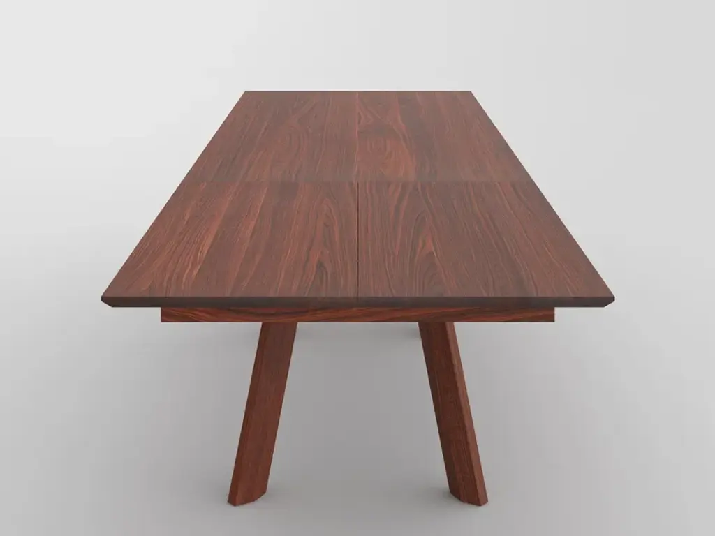 Further development of the award-winning table Rhombi - innovative smooth synchronous extension. Moving table top with folding butterfly leaf hidden inside. The solid table top slightly tapered towards the bottom in conbination with tilted rhombic legs gives the table excitement and originality. With folding butterfly leaf hidden inside, one-handed operation technology let‘s you reach a maximum length of 320 cm.The table top extends on both sides and the position of legs always remains unchanged. Spacious legroom is ensured in every position.The model RHOMBI can be supplied in the following wood types: European oak and knotted oak, ash, beech, core beech, American maple, walnut and cherry wood, treated with herbal oil.