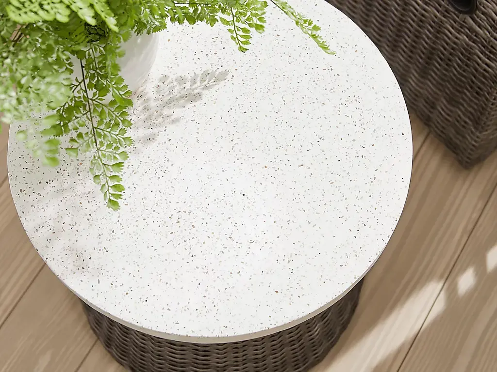 Casual outdoor style finds a new angle in the arcing curves and gentle lines of the Ria end table. With an all-weather aluminum frame wrapped in driftwood colored wicker, its terrazzo pattern tabletop is ideal for decor, drinks, and anything else you need at hand outdoors.