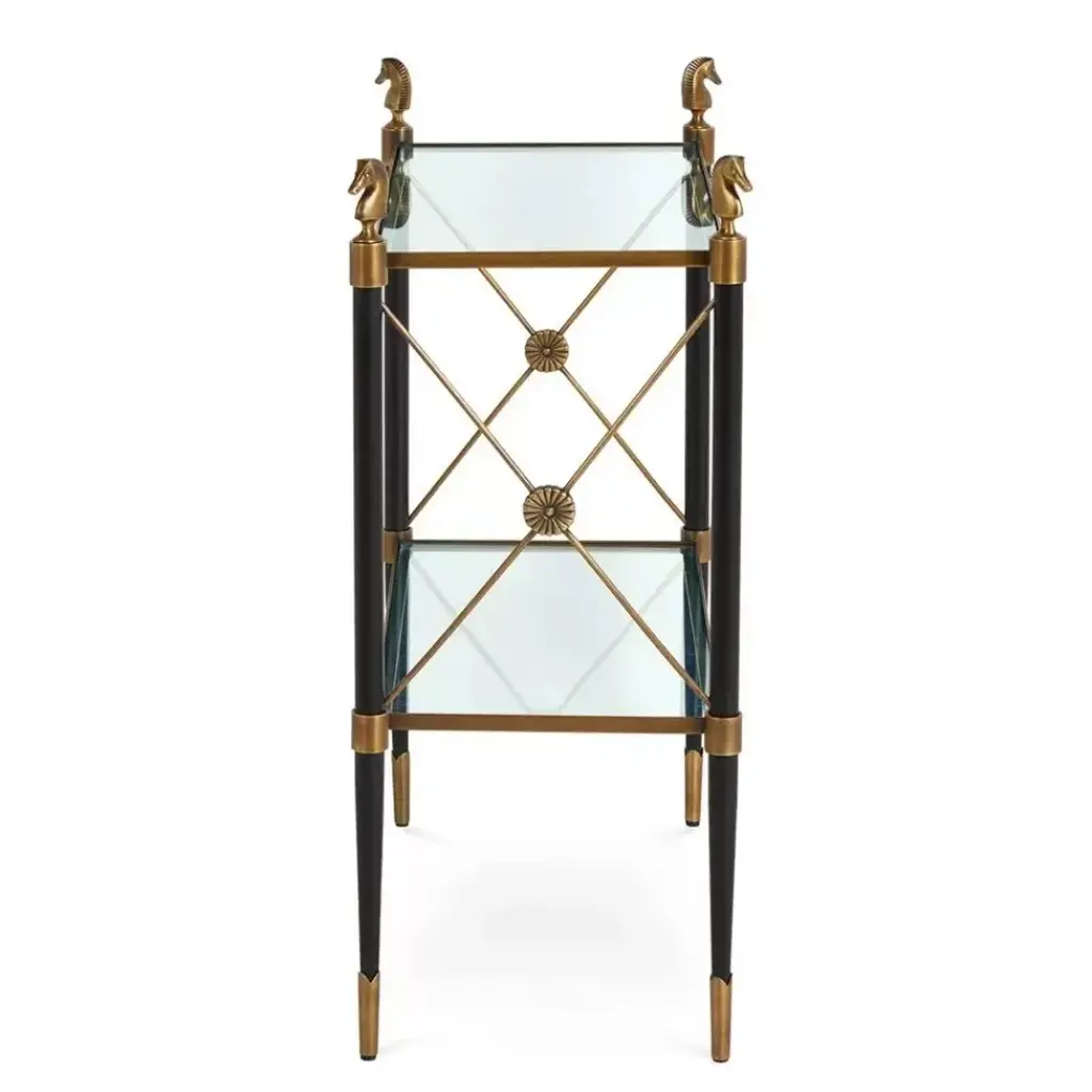 A fab storage solution for an entryway or a bathroom, our Rider Two-Tier Side Table is an updated take on French Empire style. Blackened brass legs with antiqued brass accents are capped with cast brass horse finials to create a regal vibe. The leggy base and glass shelves make this hardworking piece light and lively. Perfect as petite bookcase or next to a high-armed sofa.