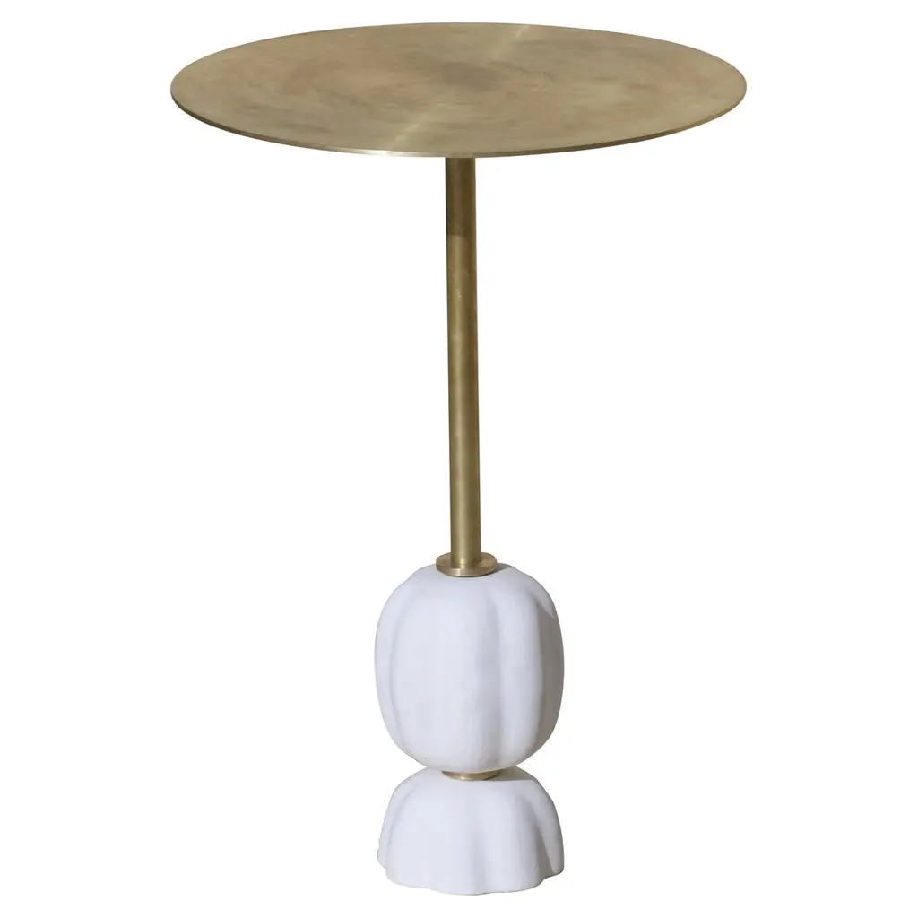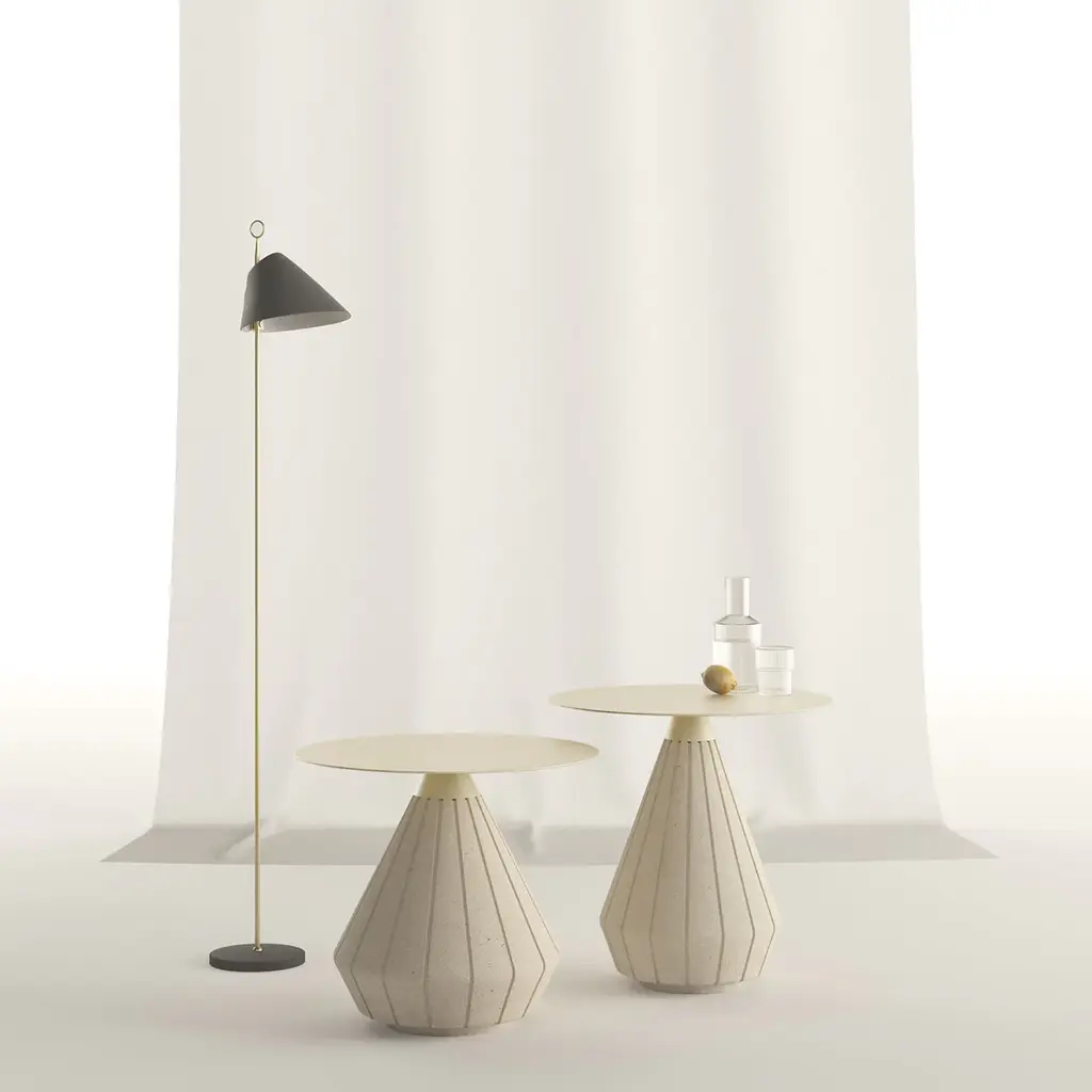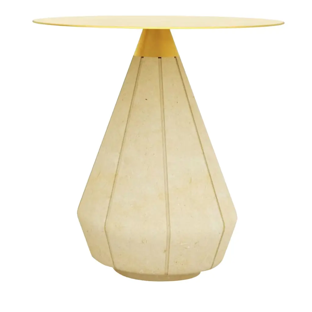 Inspired by the fruits of nature, the Rigo side tables, available in two sizes, have a sculptural shape, punctuated by subtle incisions in the smooth and silky Pimar stone, in dialogue with the metal, in different finishes. The finish of the top is in galvanized iron. Available also in brass. In its unique contemporary style, designed by Apospersano for Salone del Mobile Milano 2023.