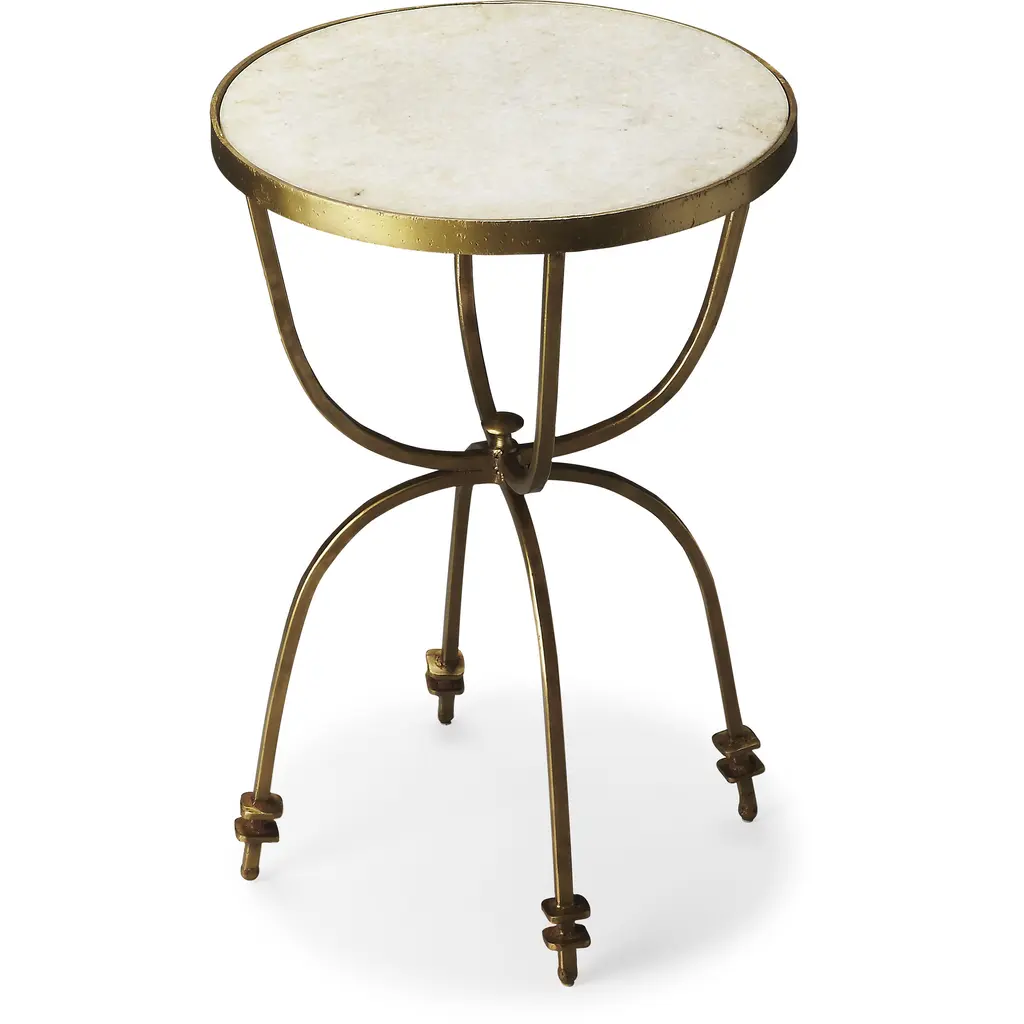 This handcrafted side table manages to feel open and welcoming while conveying a powerful presence. The white marble top is an ideal complement to the polished gold finish of the iron base.