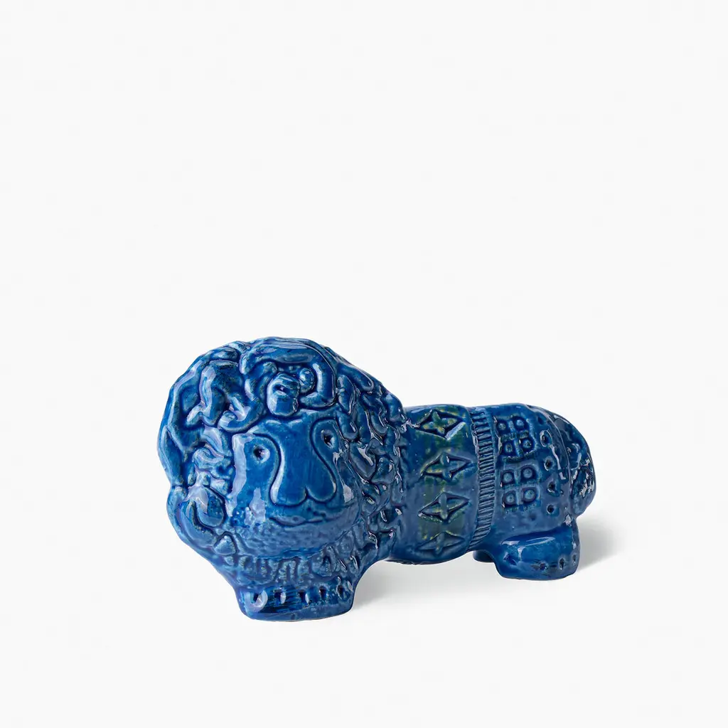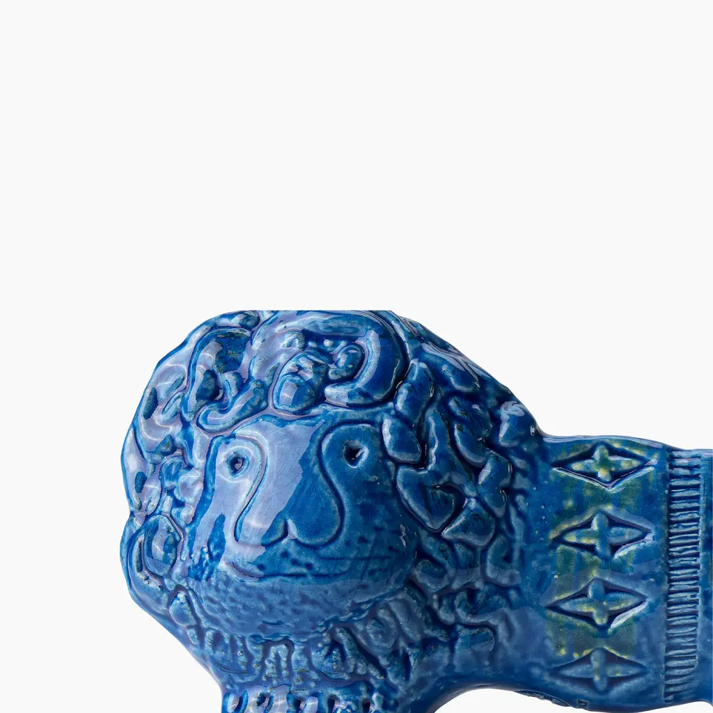 Handcrafted by skilled artisans of white refractory clay, this charming ceramic figurine depicts a lion in a regal pose, whose exquisite craftsmanship is enhanced by the distinctive blue crystalline glaze of the collection. The lion's mane and body are entirely decorated by hand with an exquisite pattern engraved on the raw clay to obtain a sleek textured finish. A dynamic and eye-catching addition to a side table or console, this piece will create an original and sophisticated centerpiece when displayed with the other animal figurines of the iconic Rimini Blu Collection.