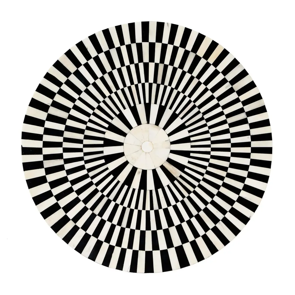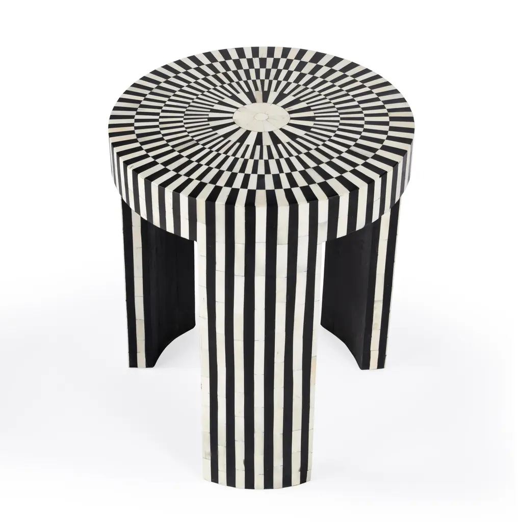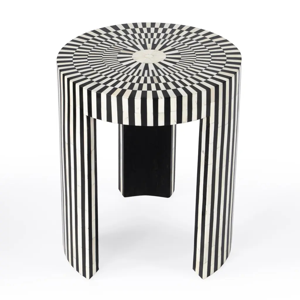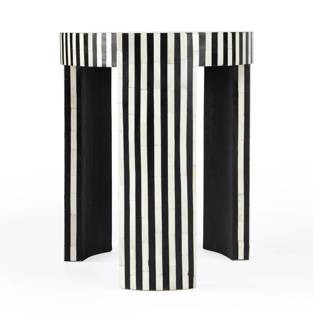 This eye-catching side table features hand-cut bone inlay and black engineered Wood that's arranged by hand in a geometric striped pattern and sits on top of three oversized curved rectangular legs. The bone has a distressed finish, and variations in the shade and markings make each table unique. Durably Constructed With: Bone, Resin, MDF Product Construction Features: Finish Distressing Product Assembled Measurement & Weight: 22.0" H x 18.0" W x 18.0" D -- 19.0 lbs. 200 lbs. Suggested weight capacity Item Arrives: Assembled Variations in shade and markings are normal and can be expected with the natural materials used in the construction of this product. Photo may slightly differ from actual item in terms of color/finish due to the lighting during photo shoot or the monitor's display.