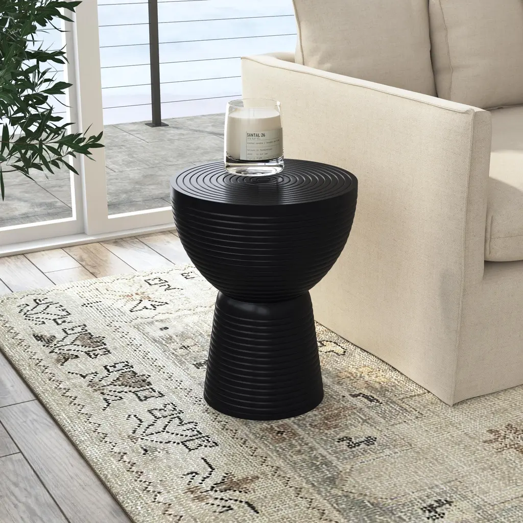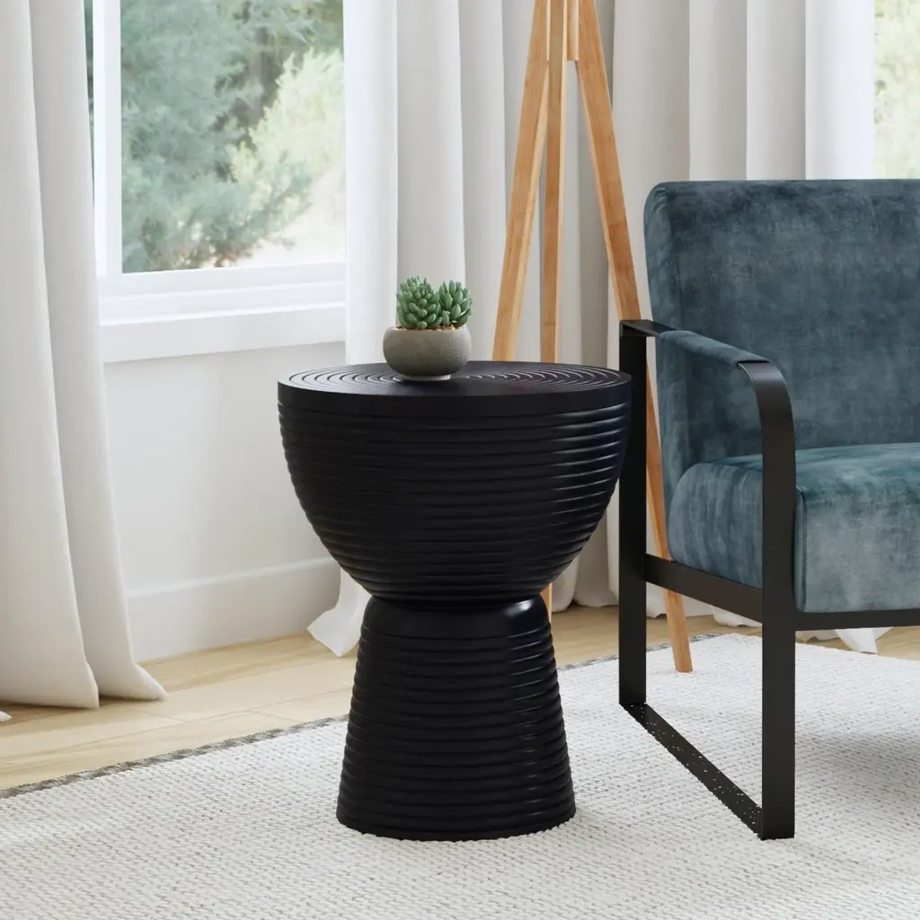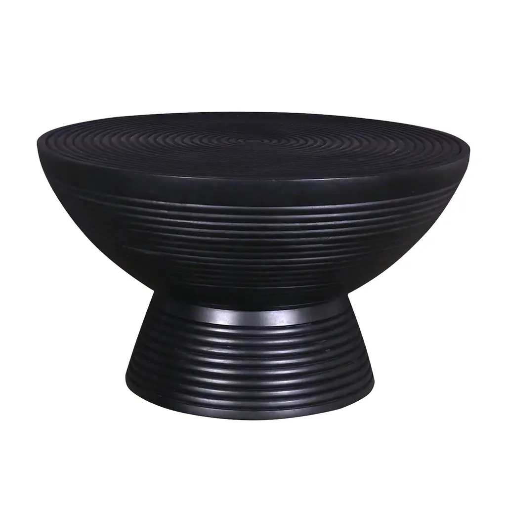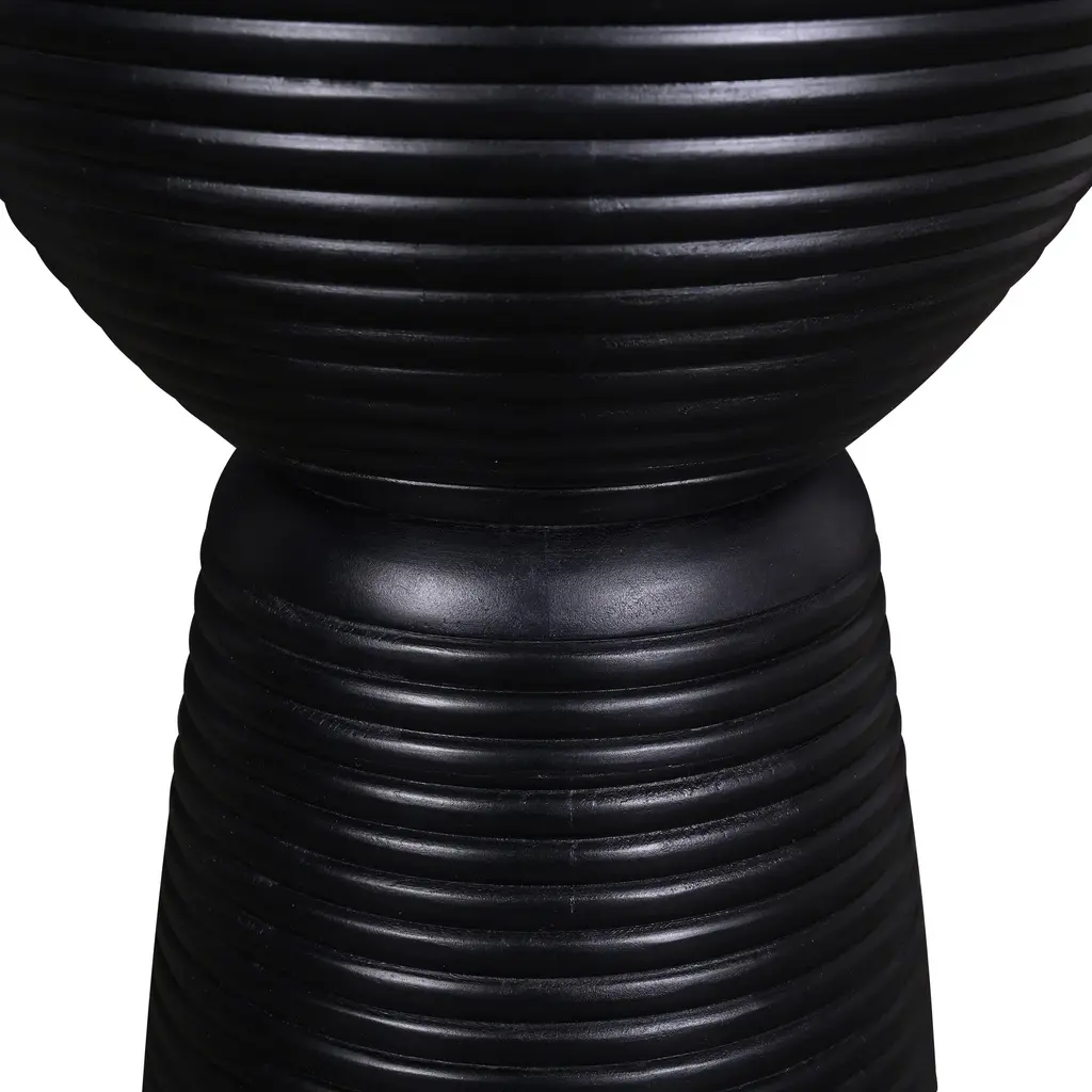 Crafted from solid, sustainable mango wood, intricately carved rings encircle this minimal, round side table finished in rich matte black. Its sleek drum silhouette and pedestal base create a contemporary, ultra-modern style. The compact footprint makes this an ideal option for small living spaces. Complete the look by pairing it with the matching coffee table.