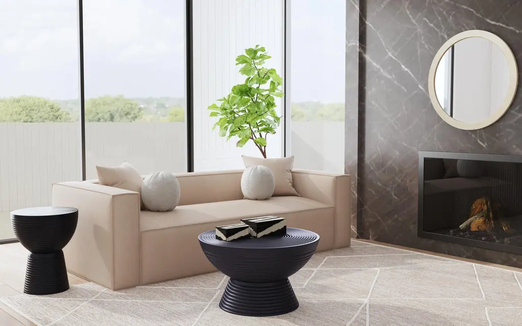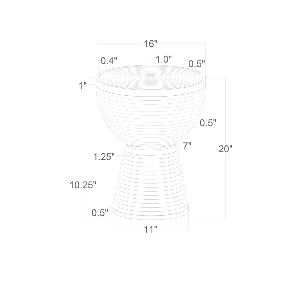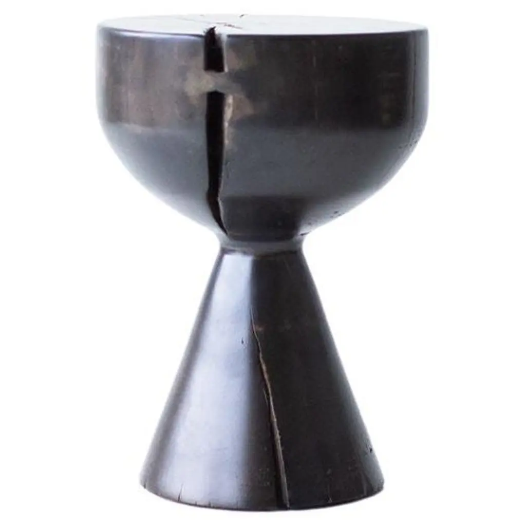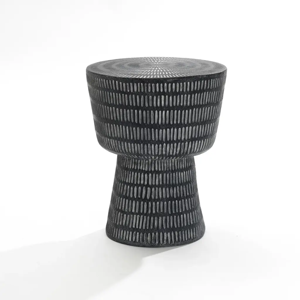 Crafted from solid, sustainable mango wood, intricately carved rings encircle this minimal, round side table finished in rich matte black. Its sleek drum silhouette and pedestal base create a contemporary, ultra-modern style. The compact footprint makes this an ideal option for small living spaces. Complete the look by pairing it with the matching coffee table.