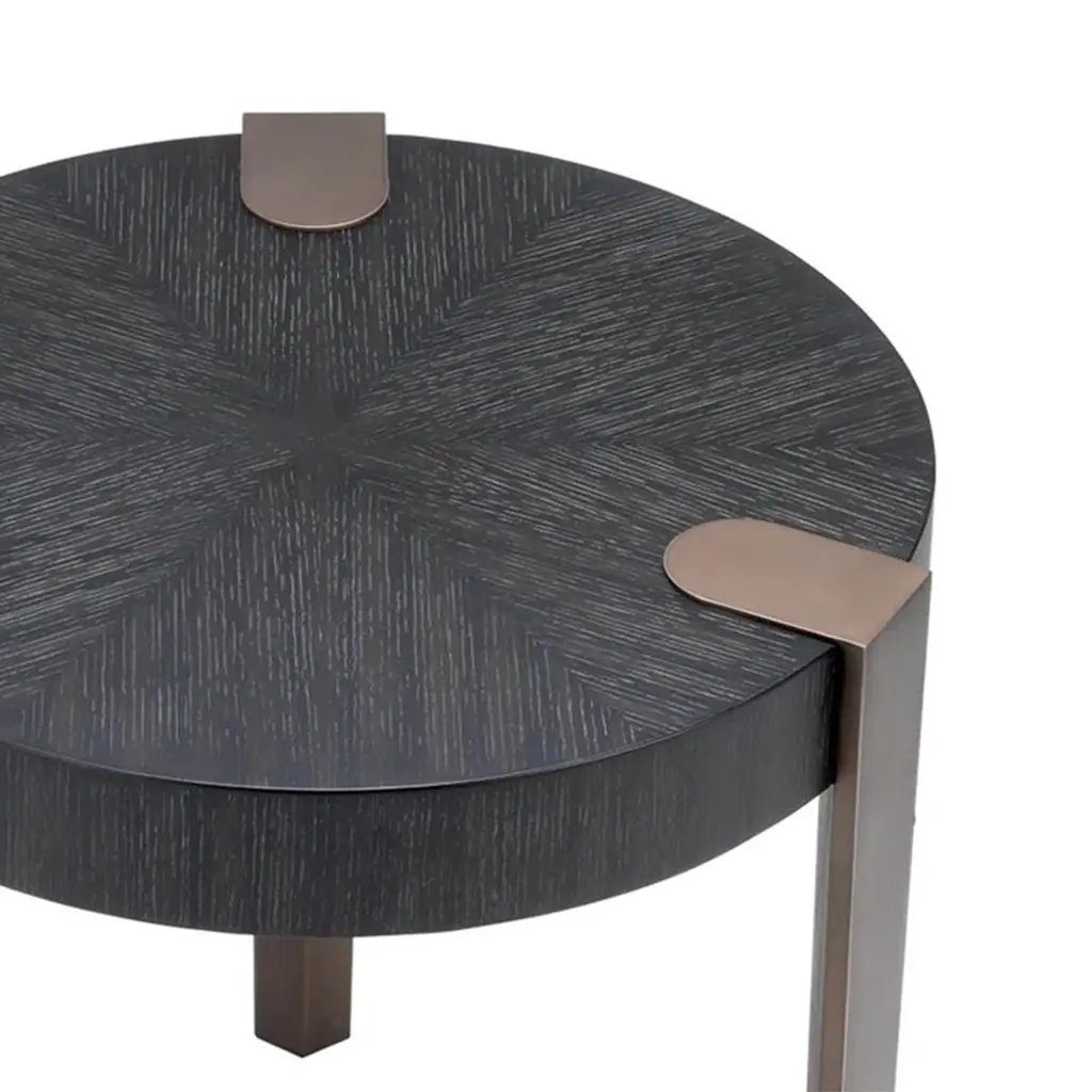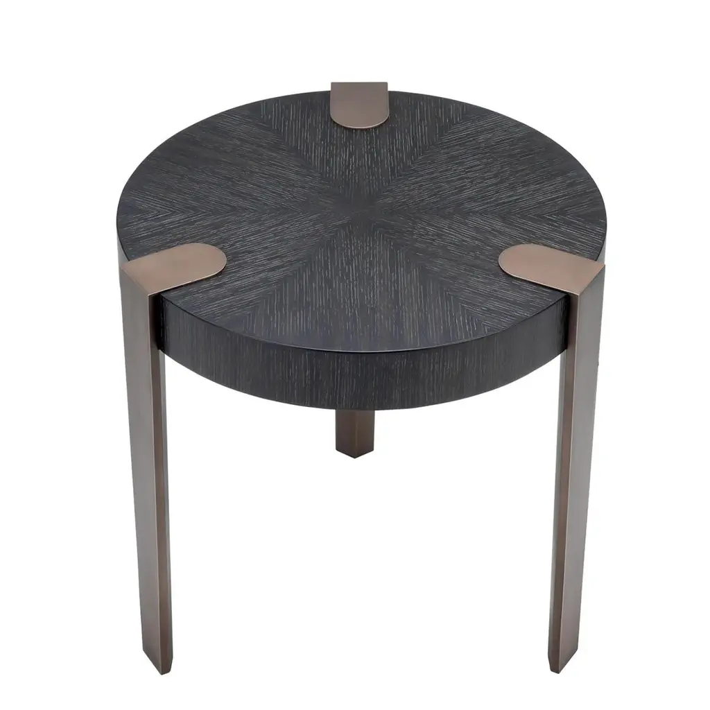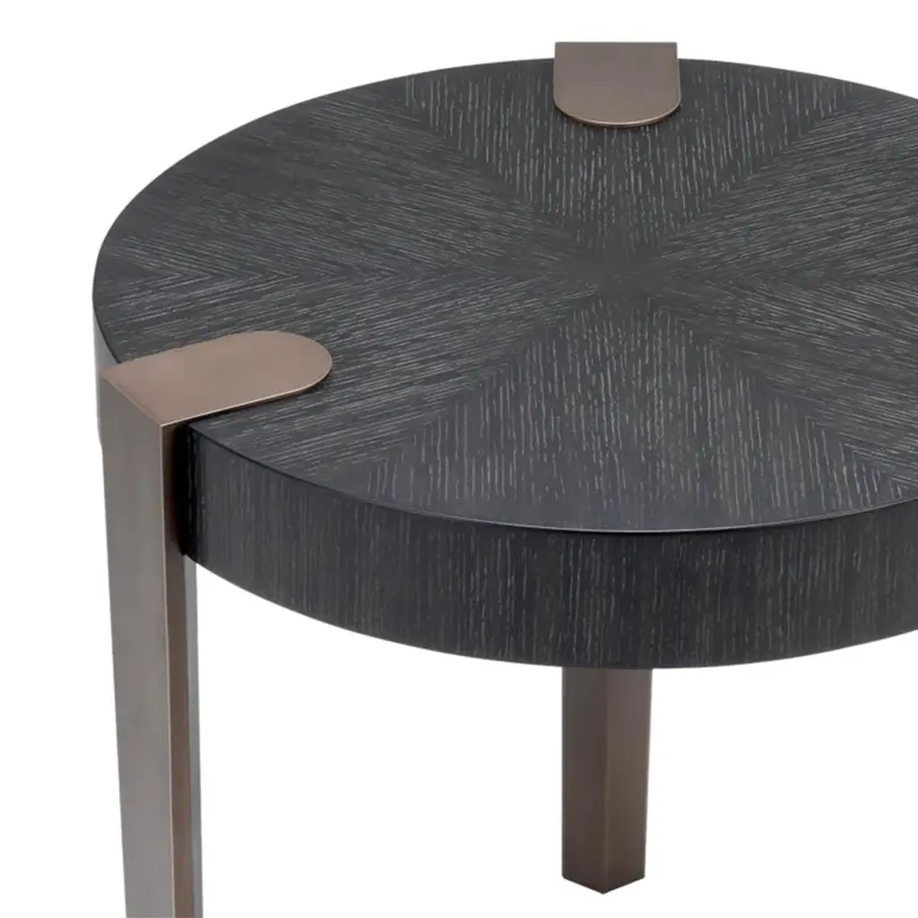 Side Table Robald with top in wood in grey oak veneer with 3 feet in steel in antique bronze finish.