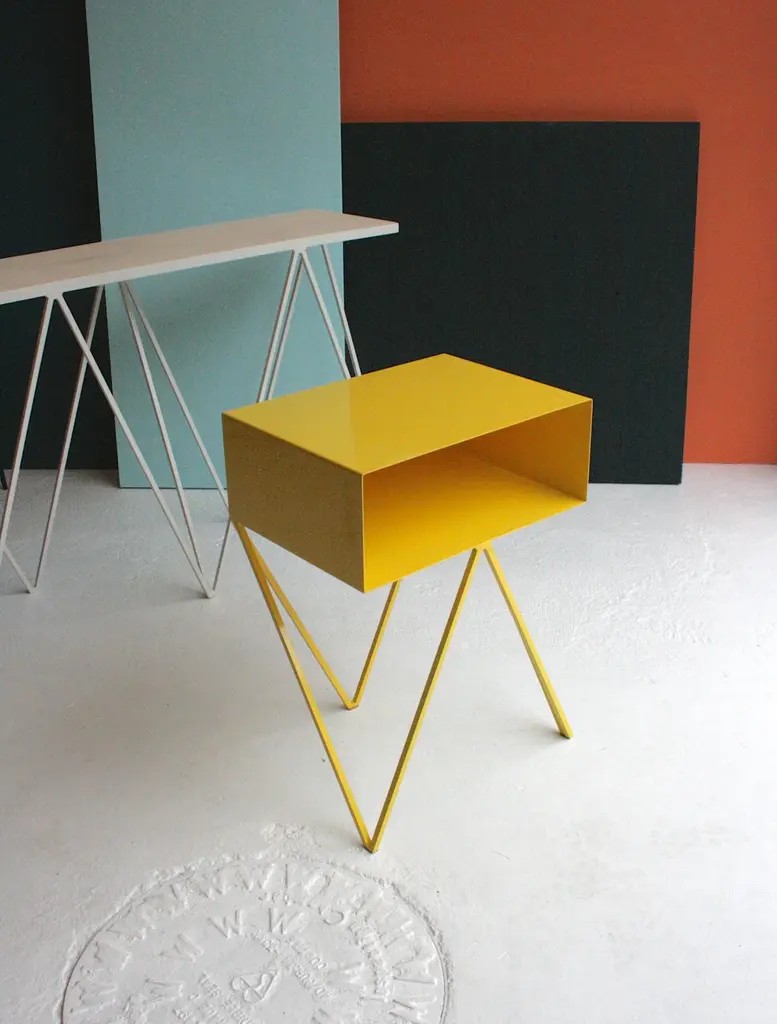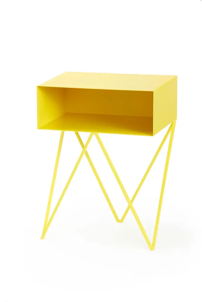 The Robot side table features an open shelf on zig zag legs. A minimal design made in solid steel, powder coated in yellow. The clean lines look great against period details as well as in modern spaces. Perfect as a bedside table.All &New products are manufactured in Britain in small batches. They have plenty of character as every weld is different. The result is a collection of furniture that celebrates those little imperfections that make objects beautiful.The inside of the shelf is 17 cm high. Labeled by Maker,Labeled by Maker