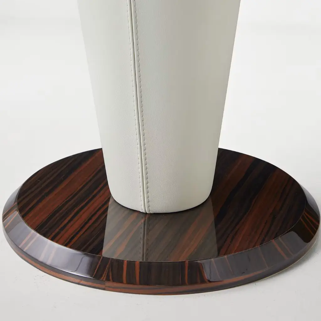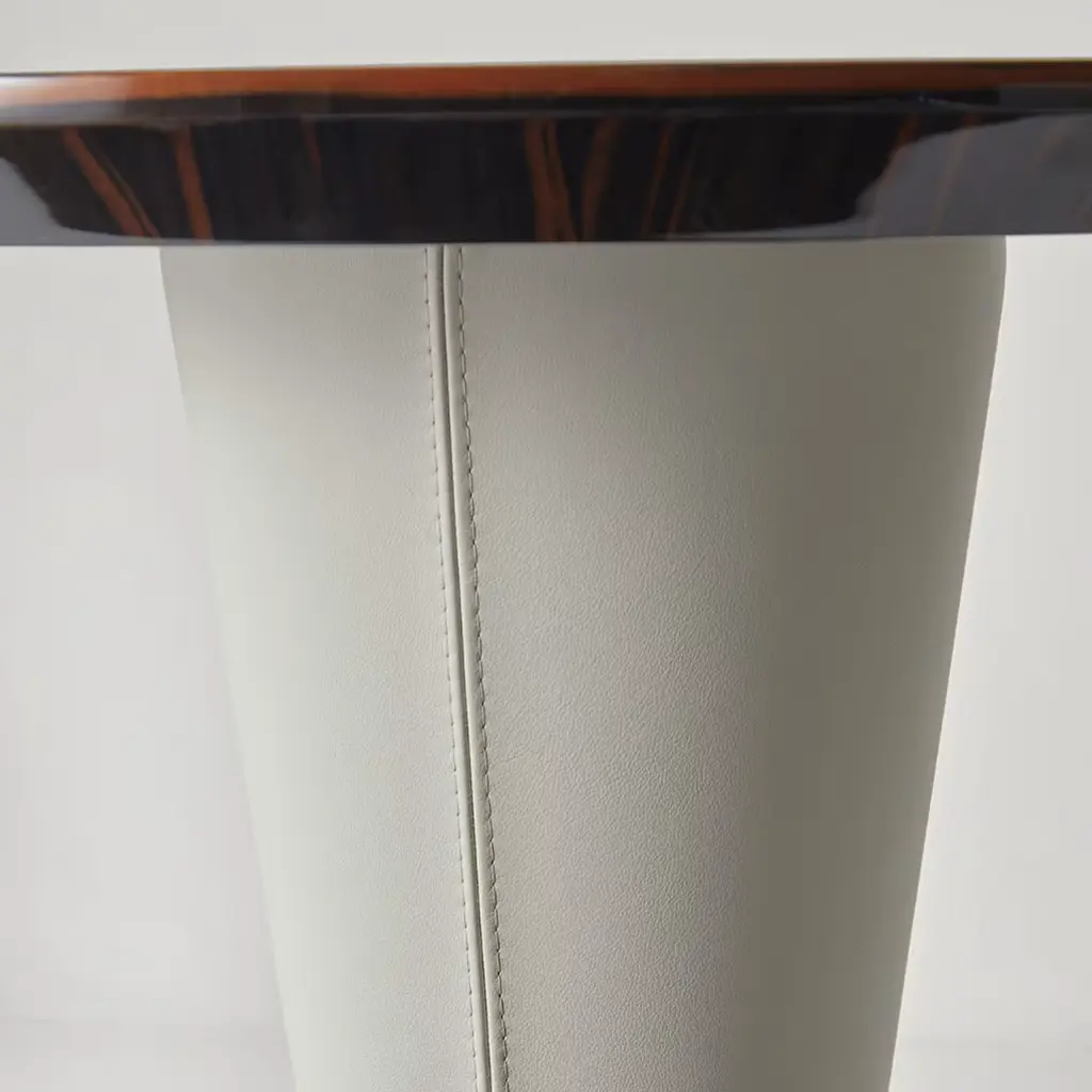 Rocchetto round side table with Ebano Macasar polished wooden top and padded leg in leather. A small jewel of all-Italian manufacturing.