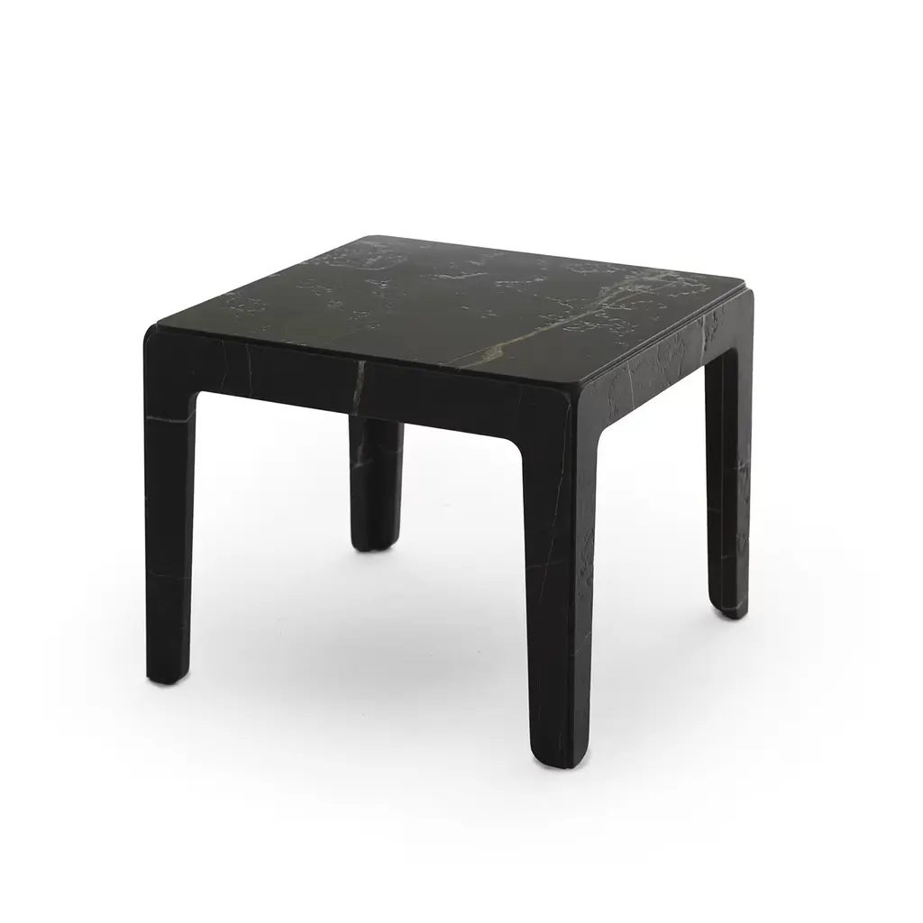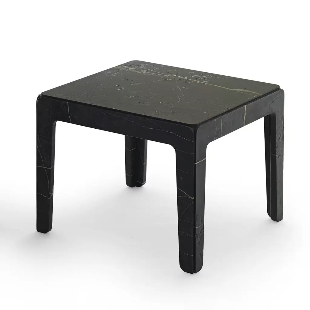 This exquisite side table, crafted in New Saint Laurent with a weathered finish, is part of the Rock collection, designed by Alberto Colzani in 2015. The simple silhouette of the piece is enriched by the striking veins creating one-of-a-kind decorative patterns on the dark background of the stone. Also available in Cipollino or white Carrara, this piece is made up of four legs and one top, connected together to form a piece that seems to be sculpted from a single block. Other marbles and finishes available - please ask the concierge.