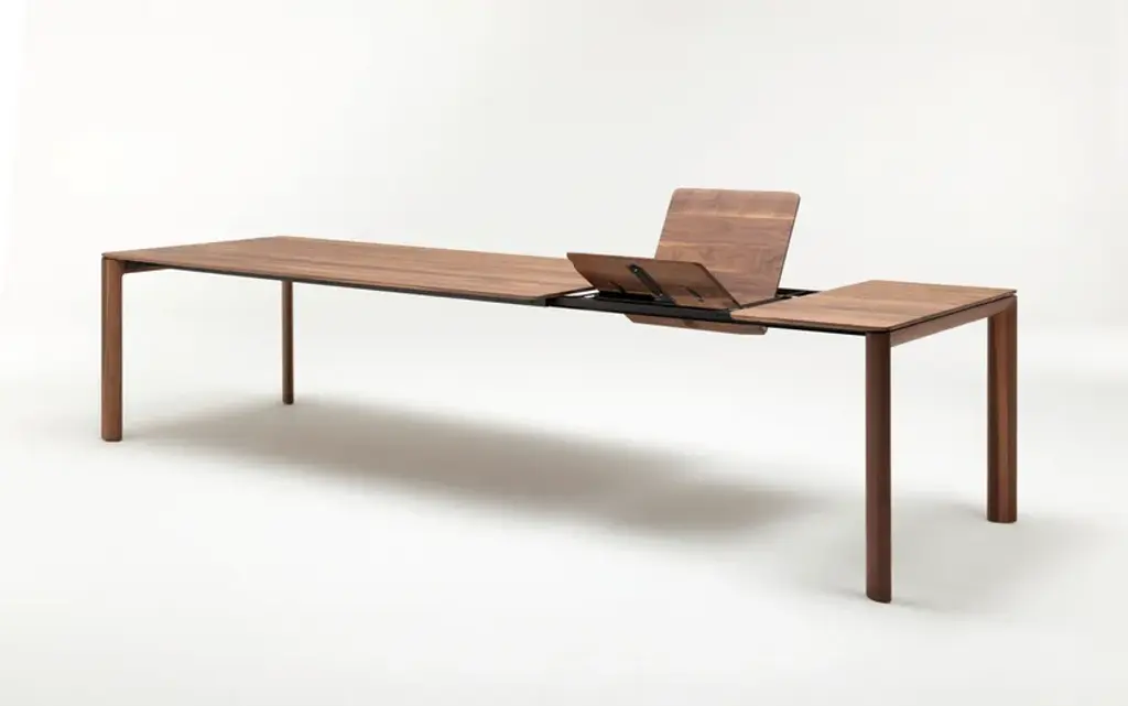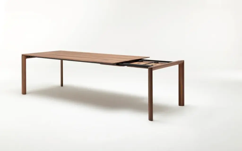 Whether fixed or as a version with an extension facility: Rolf Benz 957 impresses with its exceptional craftsmanship and a shape that bears testimony to good taste in any design. The optional, almost invisible double pull-out extension lengthens the table in two stages by 50 or 100 cm. The legs, which look like an elegantly curved ribbon, can then be extended particularly comfortably on one side using the integrated, rubberised castors, and the two-part additional tabletops can be unfolded. As a result, Rolf Benz 957 is able to adapt to any table situation effortlessly. The stable frame comes in painted solid wood, optionally in natural oak, black stained oak or American walnut. For the tabletop and pull-out extension, not only are these wood versions available, but so too are the ceramic options Calacatta smooth and Emperador Extra, producing a sophisticated material mix of wood and ceramic.• Dining table / Fixed and extendable table Table top: • Solid wood, colorless painted, options: Oak, Oak black pigmented, American walnut • Ceramic (bonded onto MDF, painted in RAL 7022 Umbra grey): Calacatta or Emperador Extra Extension leaf: The table top and extension leaf are always made of the same type of material (only wood or only ceramic), so that the design of the extension leaf is the same as the design of the main table tops. The consistency of the table top’s structure is not guaranteed.Frame: • Solid wood, colorless painted, options: Oak, Oak black pigmented, American walnut