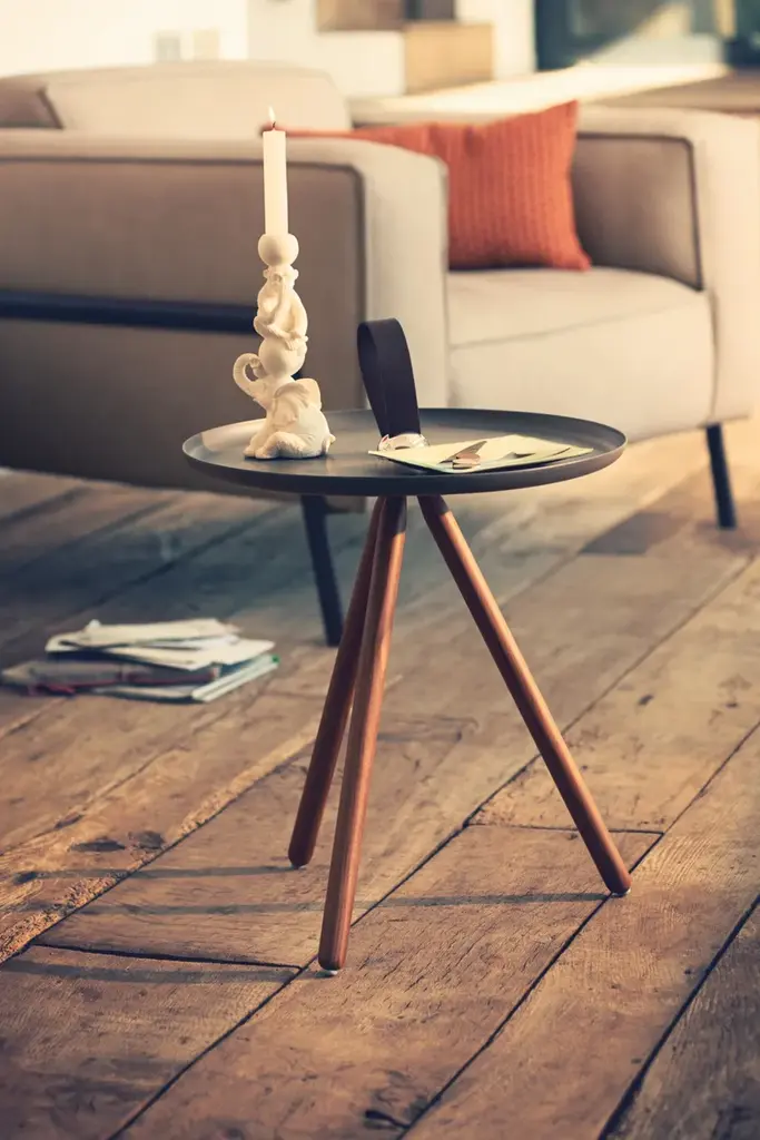 Portable, lightweight tableau Table top:• Smooth steel, powder-coated, matt (sheet steel 3 mm) in RAL 8019 grey brown, RAL 9003 signal white, RAL 5020 ocean blue, RAL 9017 traffic black, RAL 7022 umbra grey, RAL 5004 Black blue, RAL 7003 Moss grey, RAL 8002 Signal brown or Marrone metallicStrap:• Butt leather, dark brownFrame:• Solid wood, clear varnish: oak, oak black pigmented or American walnutt.