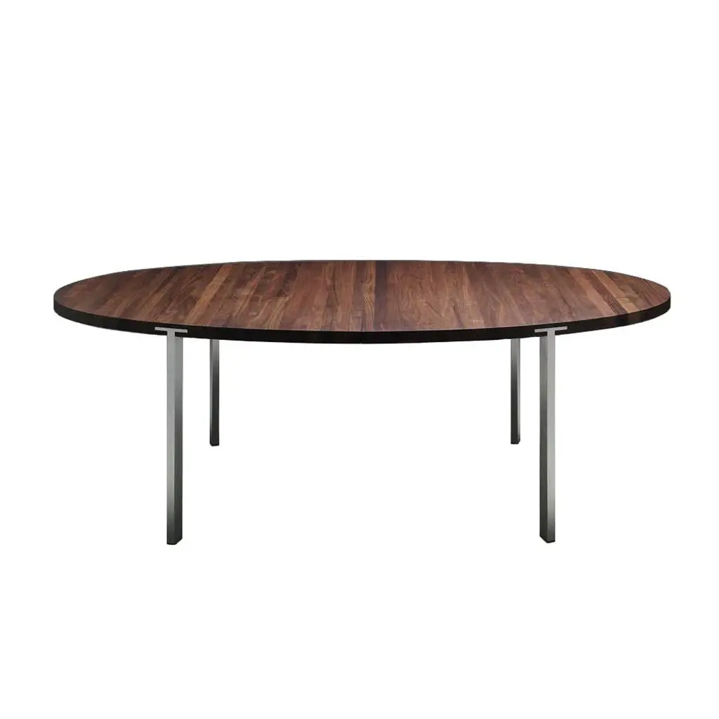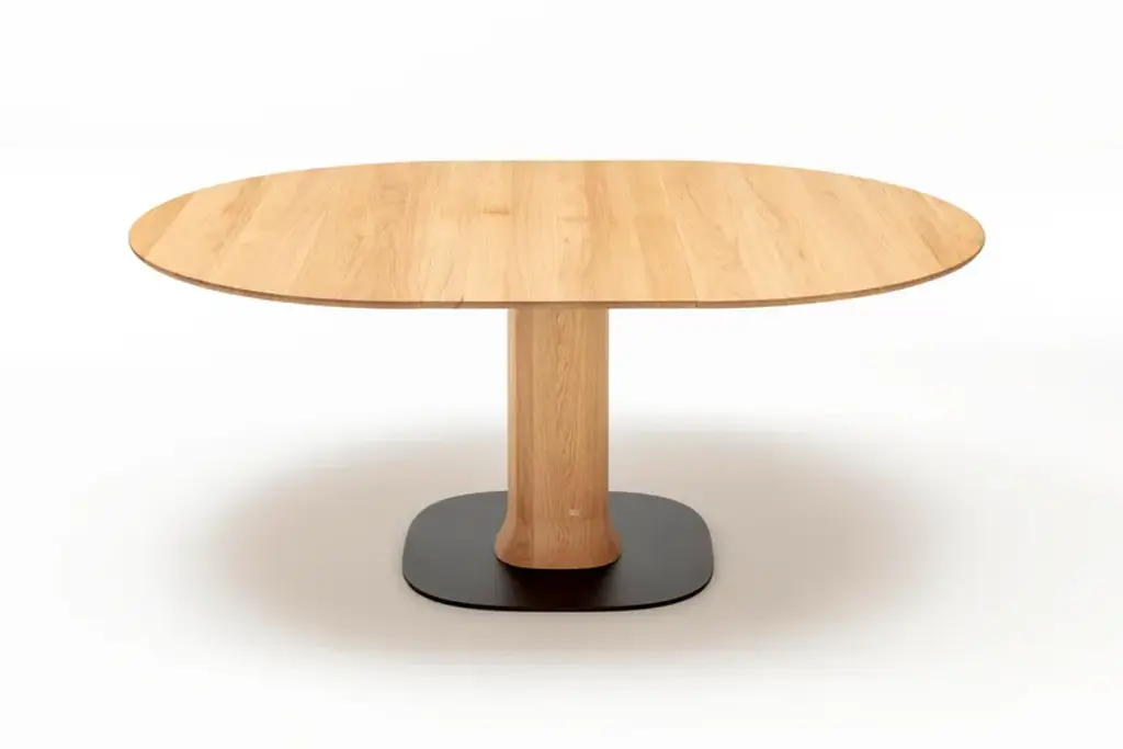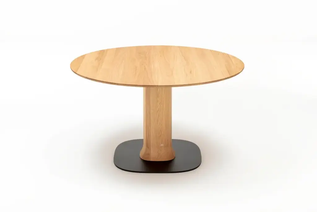 In all of its possible variants, the Rolf Benz 983 table always has a calm and consistent design that is above all trends – a timeless classic for any culinary occasion. A contrast of warm, inviting woods and a cool, scaled-back steel base complete its puristic appearance. Rolf Benz 983 comes optionally with or without an extension function. For absolute purists, this adds the finest class to the simplified round table. The table top comes in three sizes with a diameter of 110, 130 or 140 cm. The extension function of this elegant wooden dining table provides plenty of space for larger gatherings. Unfolding the hidden two-part extension leaf adds 40 or 50 cm of length depending on the table size selected.Both the table top and the table legs are available in various solid wood versions in oak and walnut which can also be combined. Natural oak or natural walnut with an oiled or varnished finish or stained black oak? The steel base plate also lets you choose: Black or Umbra grey? So many questions, but only one answer: Rolf Benz 983.Table top and frame: Solid wood, colorless painted, optionally:- Oak- Oak black pigmented- American walnutTable top and frame: Solid wood, oiled, optionally:- Oak- American walnutBase: Steel, fine structure, matt powder-coated, optionally:- RAL 7022 Umbra grey- RAL 9017 Traffic black
