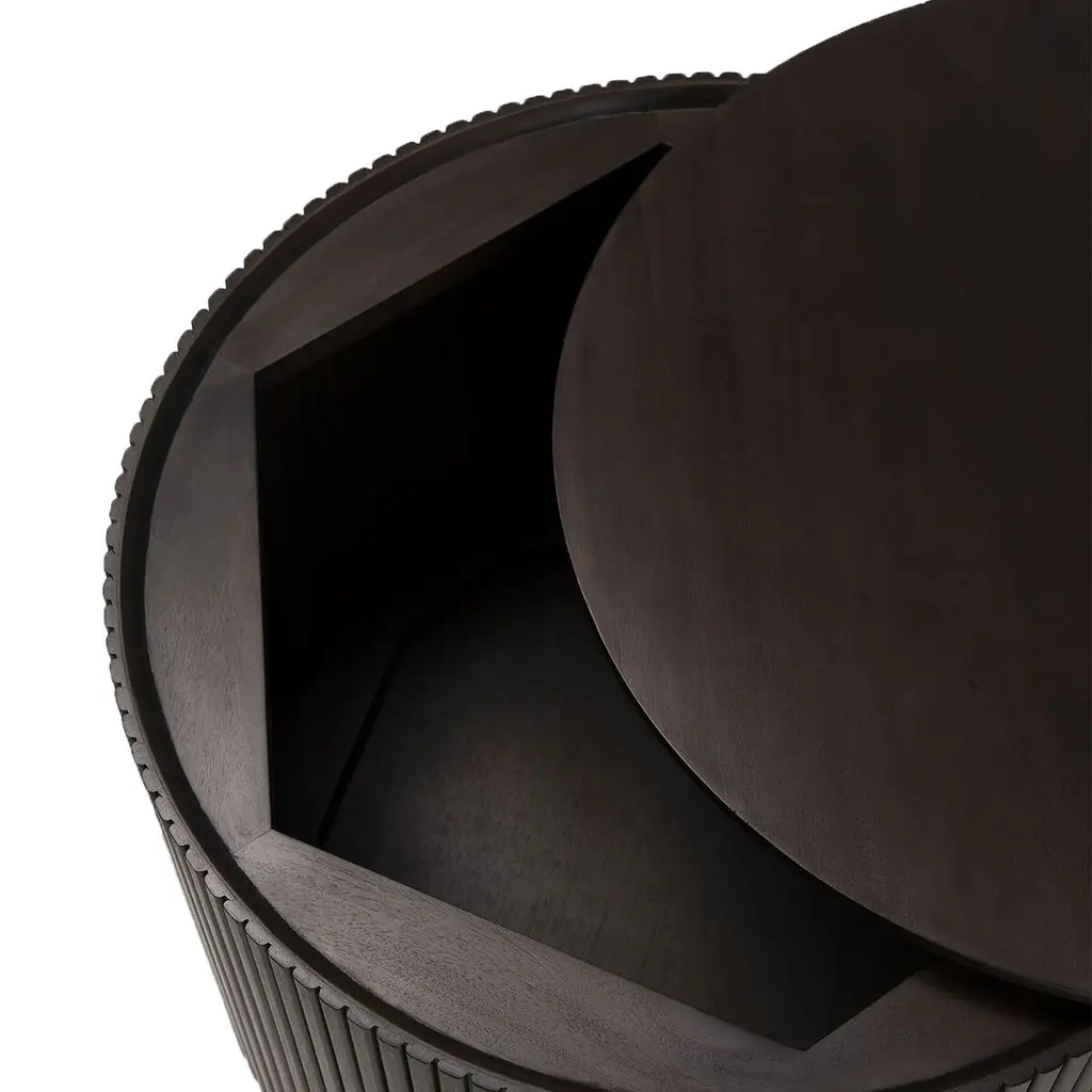 Designed by artist Jacques Deneef, this round side table offers stealth storage, thanks to a removable top that reveals a hollow center. The table is crafted of mahogany, a hardwood as durable as it is handsome.