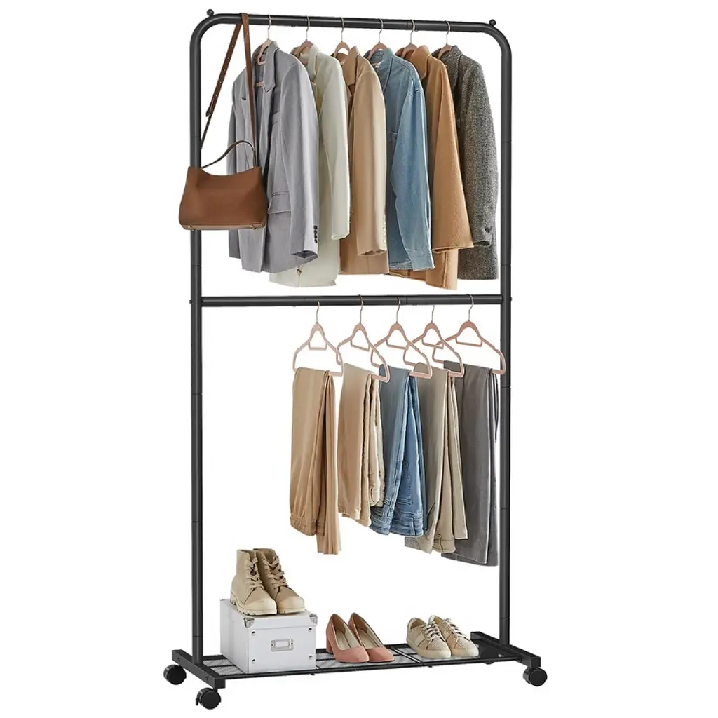 360¡ã Silent Universal Wheels: This rolling clothes rack adopts a combination design of three-layer partitions, two clothes hanging rods and two sets of side hooks to create a new vertical storage space. The clothes hanging rod is suitable for hanging dresses and trousers. The top and bottom partitions can be neatly stacked for shoes and storage boxes. The side hooks are dedicated storage places for hats, scarves, and bags, meeting the clothing storage needs of the whole family. Large Storage Space: This rolling clothes rack adopts a combination design of three-layer partitions, two clothes hanging rods and two sets of side hooks to create a new vertical storage space. The clothes hanging rod is suitable for hanging dresses and trousers. The top and bottom partitions can be neatly stacked for shoes and storage boxes. The side hooks are dedicated storage places for hats, scarves, and bags, meeting the clothing storage needs of the whole family. Adjustable Shelves: The height of the partitions of the heavy duty clothes rack with wheels can be flexibly adjusted, and the layer spacing can be freely adjusted for different clothing sizes such as long coats and short T-shirts. Say goodbye to wasted space, so that every piece of clothing can find its own storage place, and easily achieve efficient zoning management of the wardrobe. Stable and Durable: This heavy duty clothes rack with wheels is made of high-quality carbon steel material, with excellent load-bearing performance. It can easily carry heavy winter clothes and blankets, and it is not easy to deform after long-term use. The surface is sprayed with baking paint, which is scratch-resistant, wear-resistant and easy to clean. It can be wiped with a damp cloth to be renewed as new, and it will last forever. Easy Installation: This clothes rack comes with clear and easy-to-follow installation instructions and a full set of installation tools, which can be quickly assembled by following the steps. After assembly, it is recommended to check the tightness of each part connection, and you will immediately have a safe and reliable clothing storage solution.