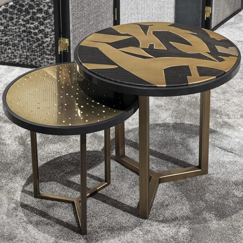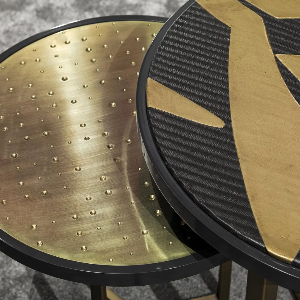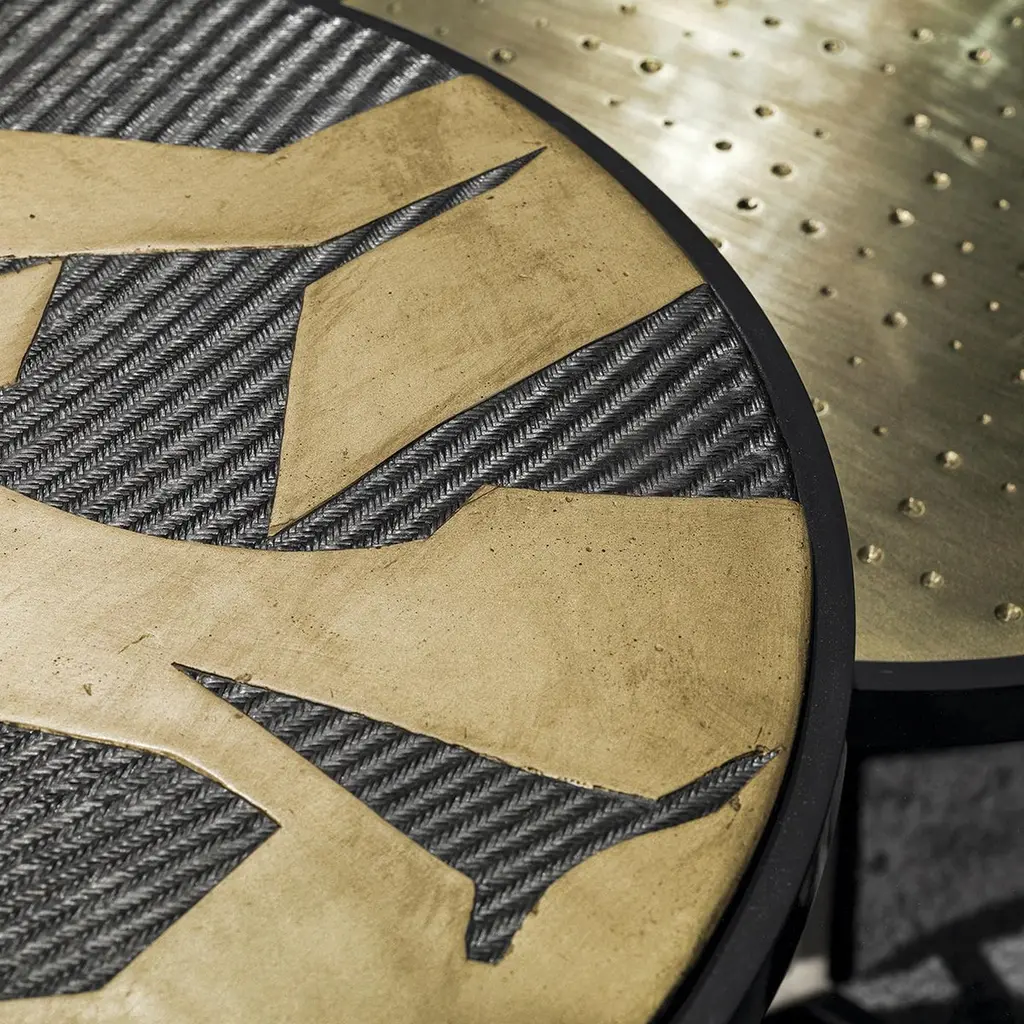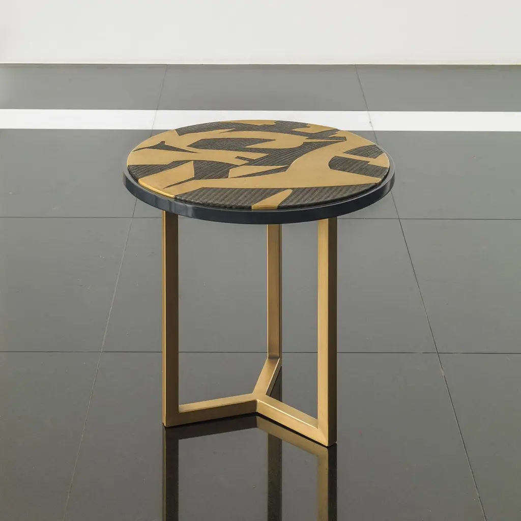 From Chiara Provasi's Couture collection, the Romeo abstract side table is the perfect complement to the Mila abstract painting sideboard. On a Minimalist gold frame, the round coffee table is adorned with an abstract design, crafted in gypsum and carbon fiber, creating a luxurious but fun look for an opulent living room or lounge area.
