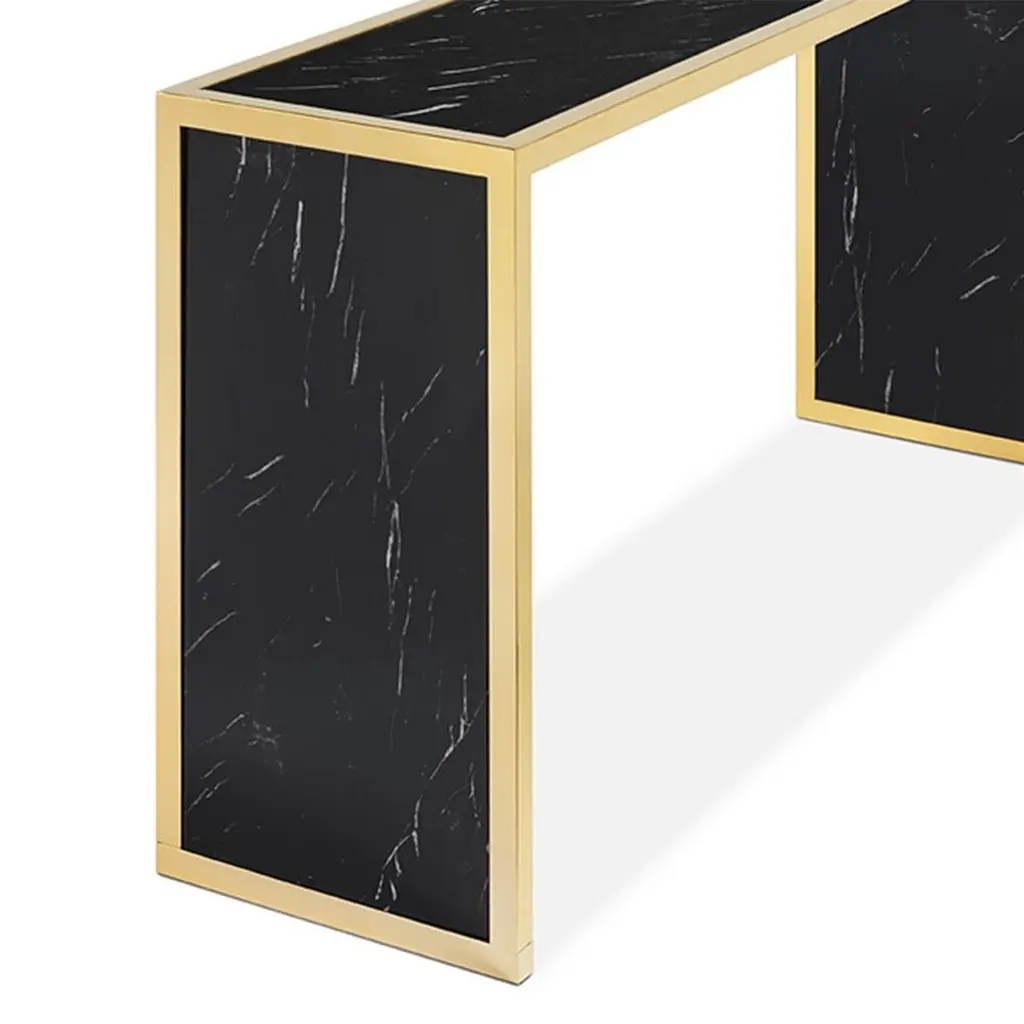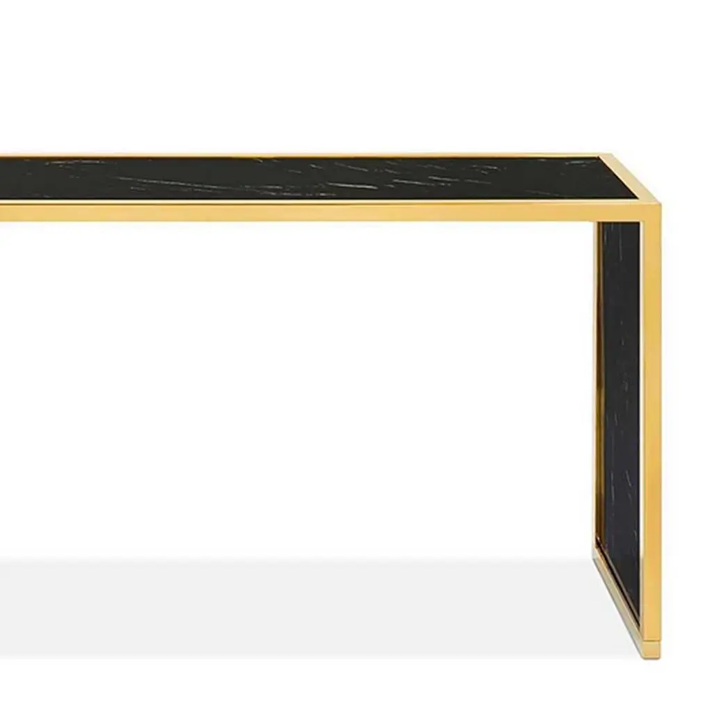 Console table Romer black with steel structure inpolished gold finish, with marble black top and withmarble black sides.