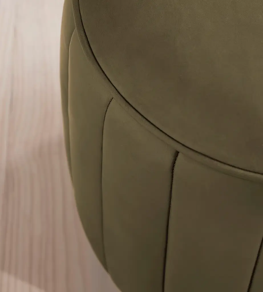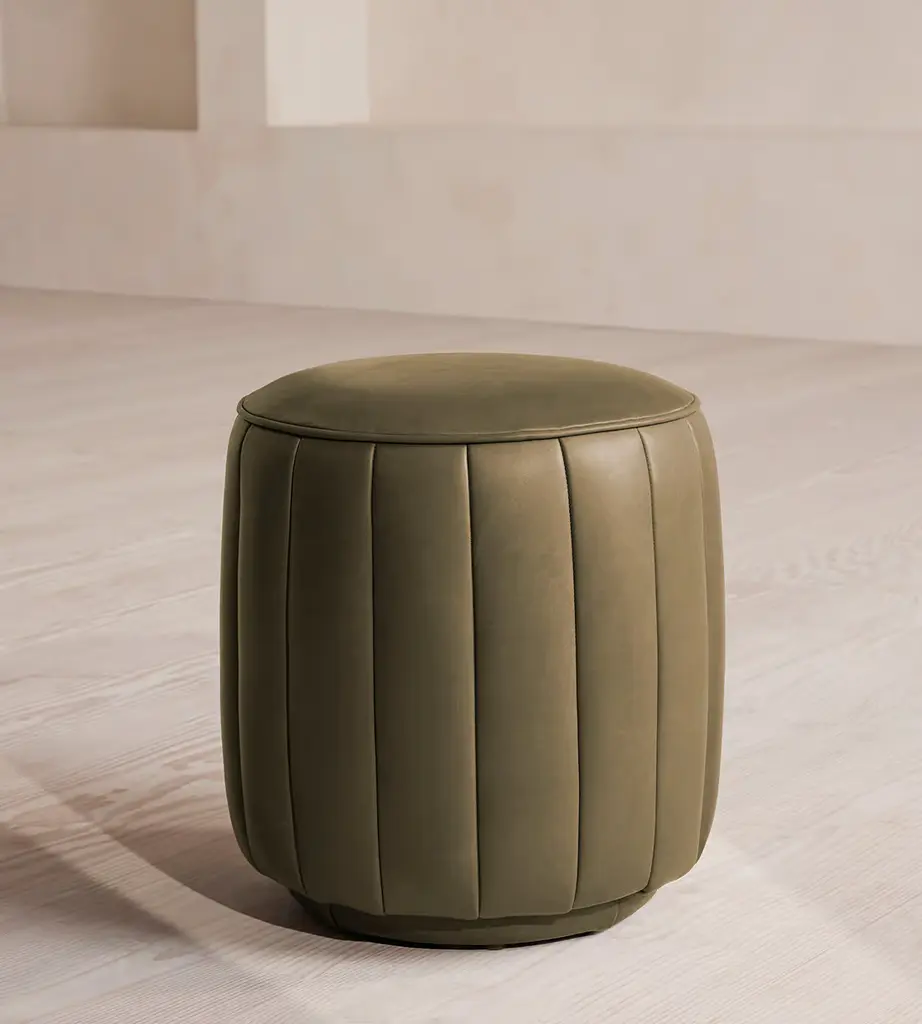 A compact, round silhouette fully upholstered in leather. The Romi footstool is fully upholstered in fluted leather, in the shade Moss. The design is complete with a matching piped trim.