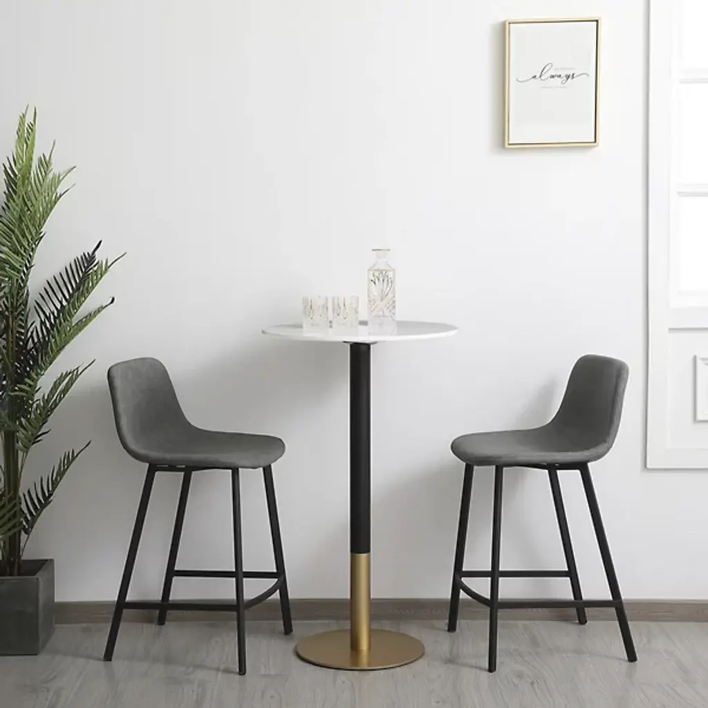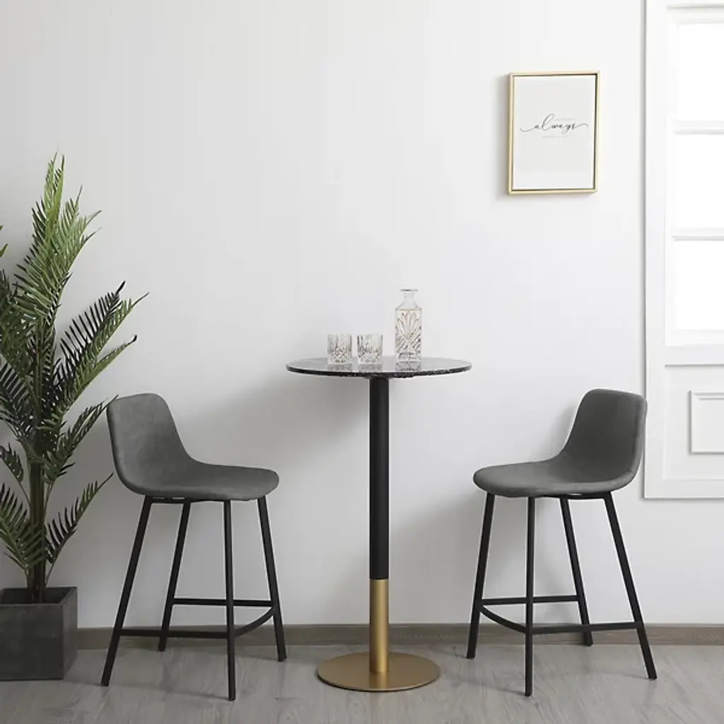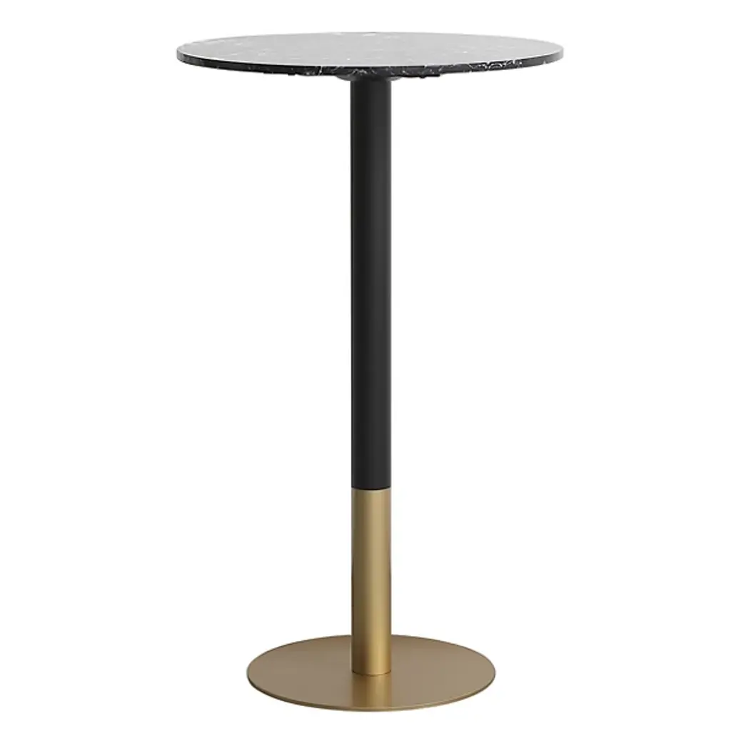 The Ronan Bar Table from Elegant Lighting elevates dining through faux marble surface treatment paired with industrial steel construction. The matte black and gold powder coating creates tonal depth across the metal base while the weighted foundation ensures stability. The contrasting materials of stone-look surface and metal framework establish visual interest through their complementary textures and finishes. This pub table brings sophisticated bistro styling to interior spaces while maintaining compact proportions. It is suitable for intimate dining experiences and efficient space utilization in various room configurations.