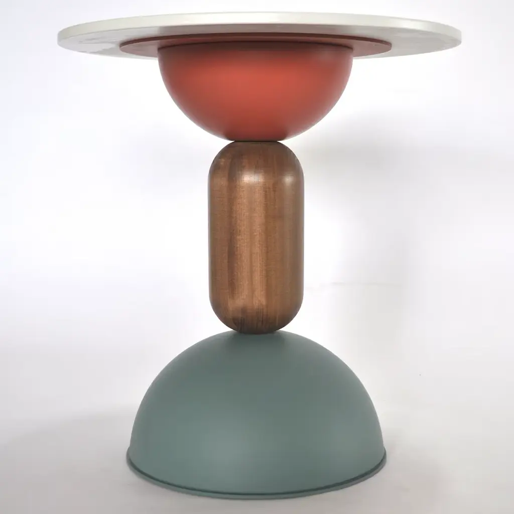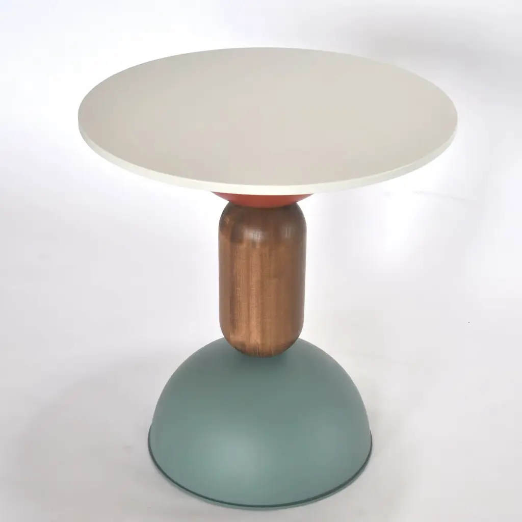 An exquisite interplay of geometric shapes balancing in a stunning, stately shape, this side table combines wood and metal in a fascinating design. An iconic addition to a contemporary interior, it features a white lacquered wooden top, and a metal and wooden body. Available in various colors, please ask the Concierge for details.