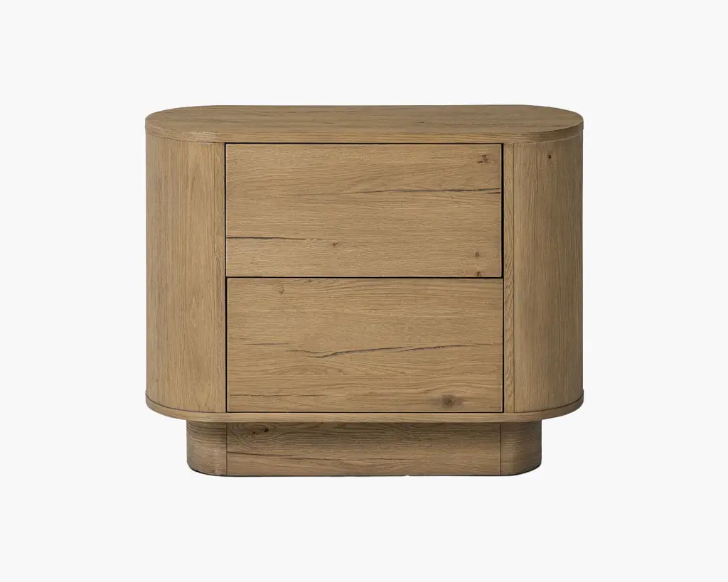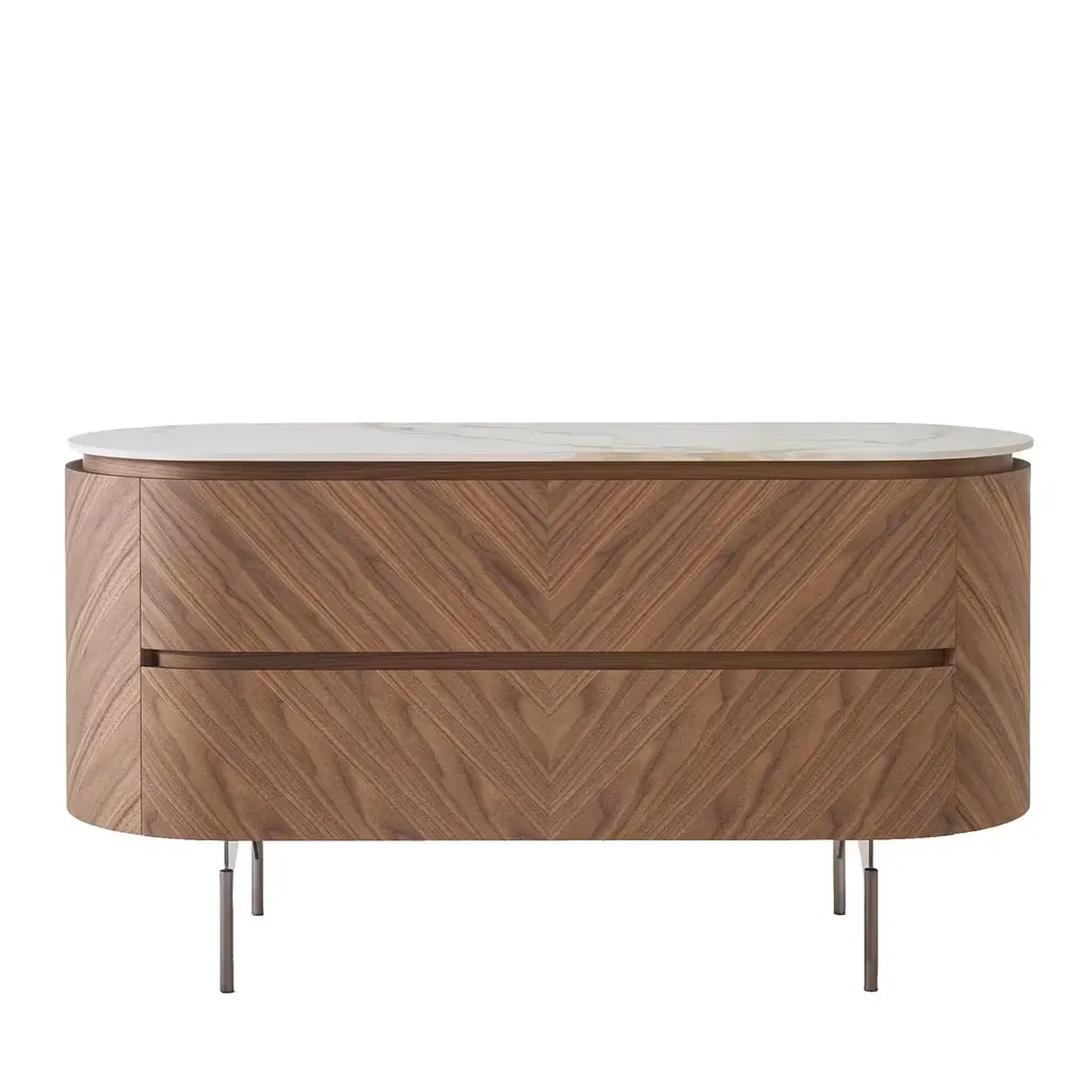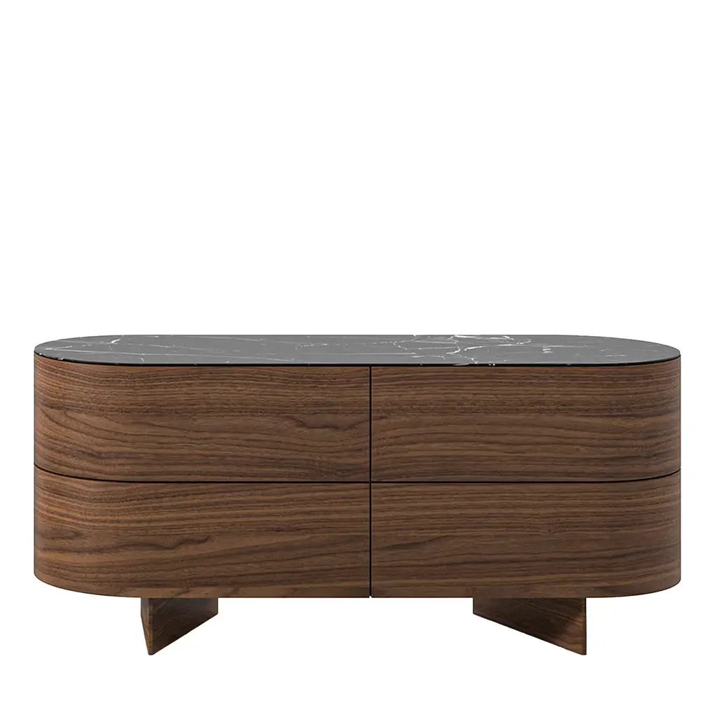 Rondos - Cabinet with 3 drawers, structure in Canaletto walnut wood, top in Marquina marble (COD. M02). This chest of drawers is characterized by soft, rounded forms that match the Bio-mbo bed and bedside tables to create a welcoming and informal bedroom space. The structure and feet are made of curved wood with a stained black oak, Canaletto walnut, or burgundy oak veneer; the wooden drawers have a push-pull opening and a soft closing mechanism, while the top is in veneered MDF in the same wood as the structure or in three marble variants: Carrara, Marquinia, Grigio Carnico. Rondos is available in two sizes: with two pairs of large drawers placed side by side or three drawers, one on top of the other.