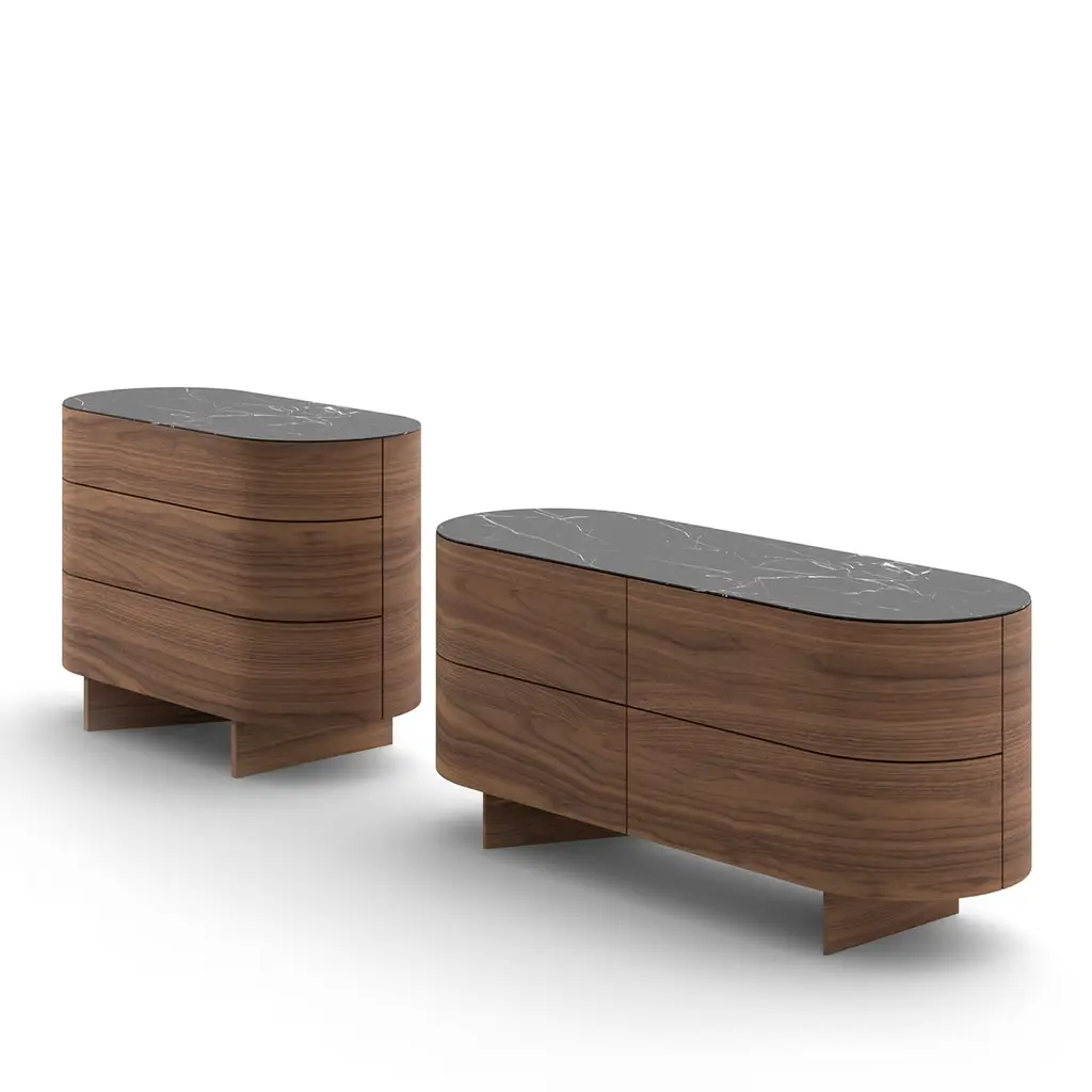 Rondos - Cabinet with 4 drawers, structure in canaletto walnut wood, top in Marquina marble (COD. M02). This chest of drawers is characterised by soft, rounded forms that match the Bio-mbo bed and bedside tables to create a welcoming and informal bedroom space. The structure and feet are made of curved wood with a stained black oak, Canaletto walnut or burgundy oak veneer; the wooden drawers have a push-pull opening and a soft closing mechanism, while the top is in veneered MDF in the same wood as the structure or in three marble variants: Carrara, Marquinia, Grigio Carnico. Rondos is available in two sizes: with two pairs of large drawers placed side by side or three drawers, one on top of the other.
