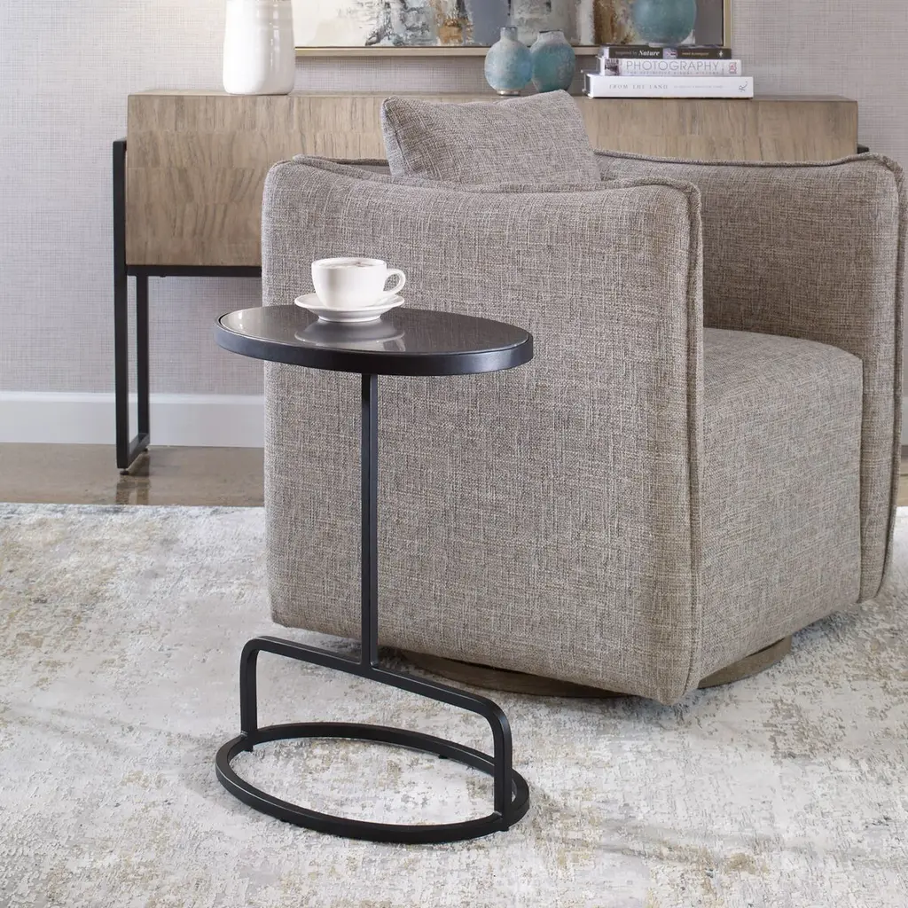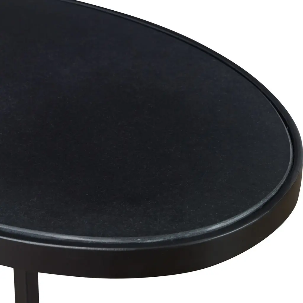 Introducing the Rosa Accent Table, a masterpiece of elegance and sophistication. This table is a harmonious blend of form and function, designed to captivate and charm. Its clean-lined silhouette is graced with an inset oval-shaped top, crafted from exquisite natural stone. Each piece is a unique work of art, showcasing the inherent beauty of natural marbling and veining, ensuring no two tables are alike. The top is gracefully supported by a hand-forged iron base, a testament to skilled craftsmanship and timeless design. The Rosa Accent Table is more than just a piece of furniture; it is a statement of style and a celebration of natural beauty, destined to be the centerpiece of any room.