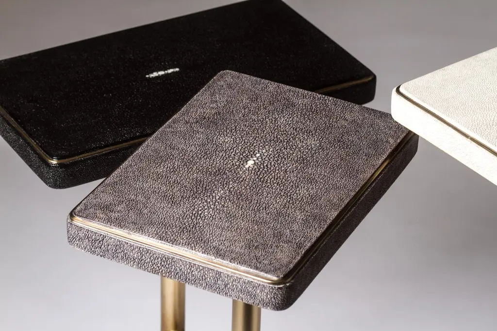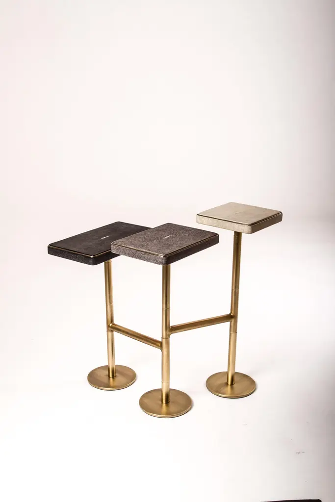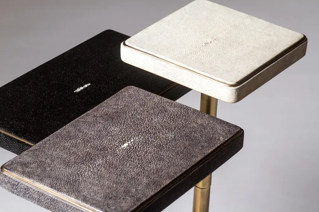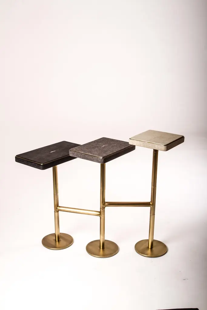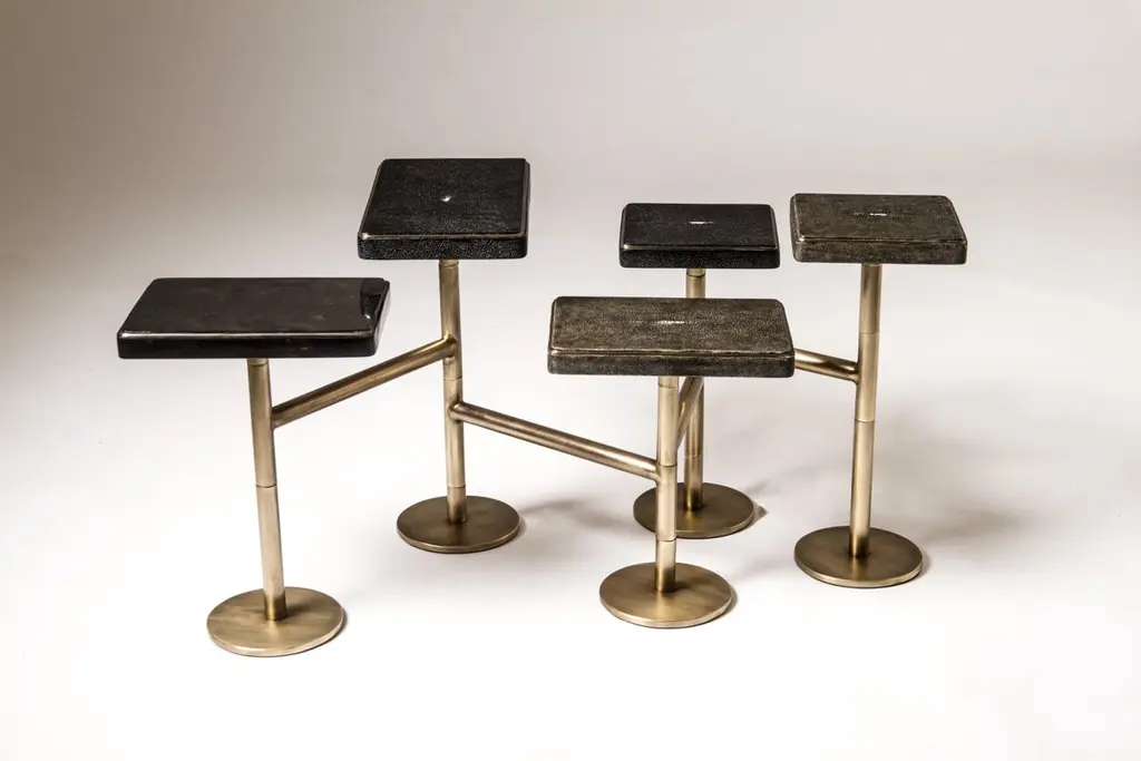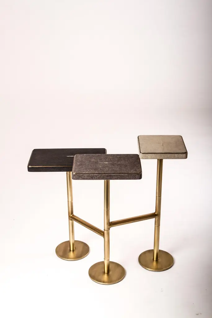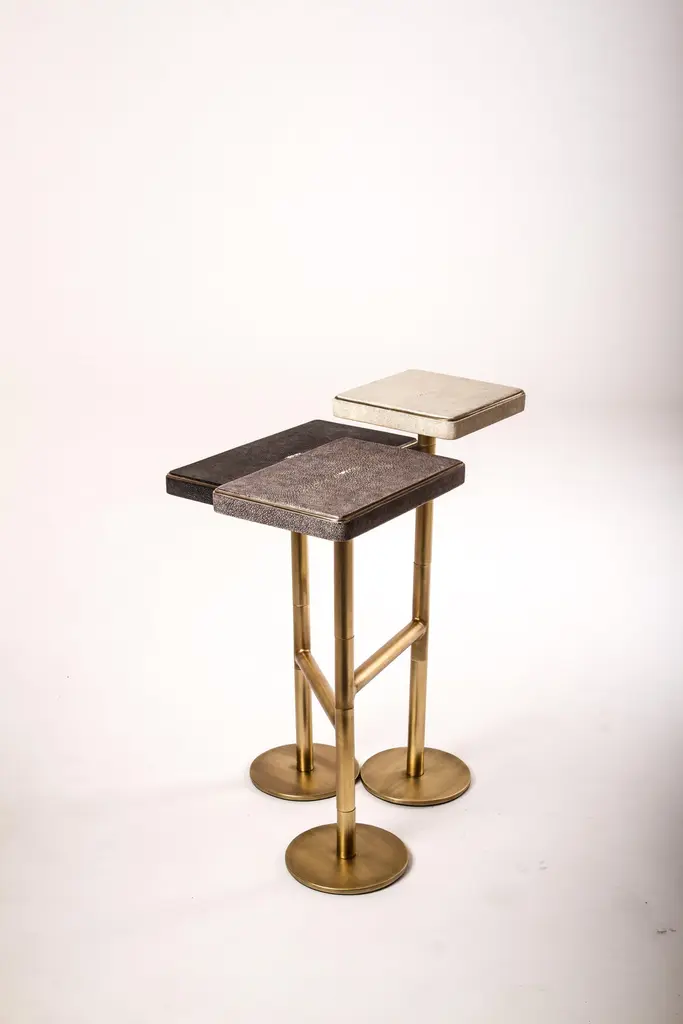 The Paris based label has distinguished themselves since their launch, with their iconic use of shagreen mixed with brass and other exotic materials. All furniture is handcrafted by skilled artisans, ultimately making each piece unique, designed in Paris and produced in the Philippines.The 3-top rotating side table in cream shagreen, grey-blue shagreen and coal black shagreen is completely mobile, allowing one to adjust the piece to their preference from elongated to clustered. The shagreen inlaid tops have a discreet metal border indentation that adds another luxurious detail to the overall design. The tops sit on elegant bronze-patina brass legs. This design makes for a playful end table or cocktail table in any space. A 5-top coffee table version is also available, image at end of slide. This piece is designed by Kifu Augousti, the daughter of Ria and Yiouri Augousti. The dimensions of these pieces are: 70 x 35 x 60 cm / 27.5 x 13.75 x 23.75"All Kifu Paris pieces are handmade by artisans, ultimately making each piece unique. Custom color or sizing available on request.Wipe clean with soft dry cloth.Although inspired by her parents, her collection of home accessories and furniture is a distinct identity of its own. Kifu uses handmade techniques of elaborate inlay patterns of shagreen, shells, semi-precious stones, materials she experienced as a child growing up in her parent’s studio, but interpreted in a younger quirkier way reflecting her youth. From her "jewelry inspired knobs" on decorative boxes, gold bar boxes and an extravagant inlay pattern mix of shagreen and shell inspired by galactic constellations, as seen on her enormous round mirror, is refreshing to see. Kifu embodies whimsical elements throughout her collection and is not afraid to be daring and unexpected in her approach to design.All shagreen-covered items should be kept out of direct sunlight, color variants may occur on the stingray and other exotic finishes, but this showcases the Parisian label's commitment to creating authentic luxurious products using natural components.